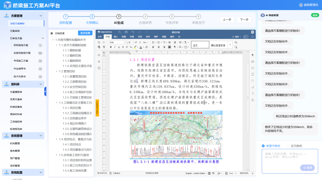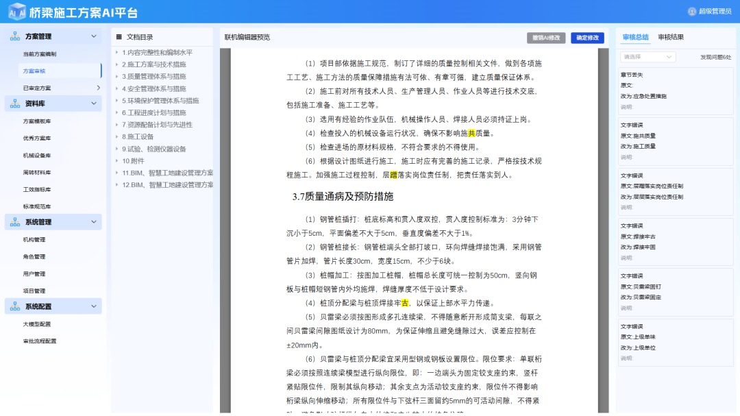 针对传统方案编制周期长、标准不一的问题,项目部依托先锋桥梁大模型,形成“AI初稿-人机共改-协同编辑-智能审查”全流程。平台覆盖投标施组、专项方案、技术交底等各类文档,内置“检索增强生成+双重校验”机制,确保内容有规范依据。