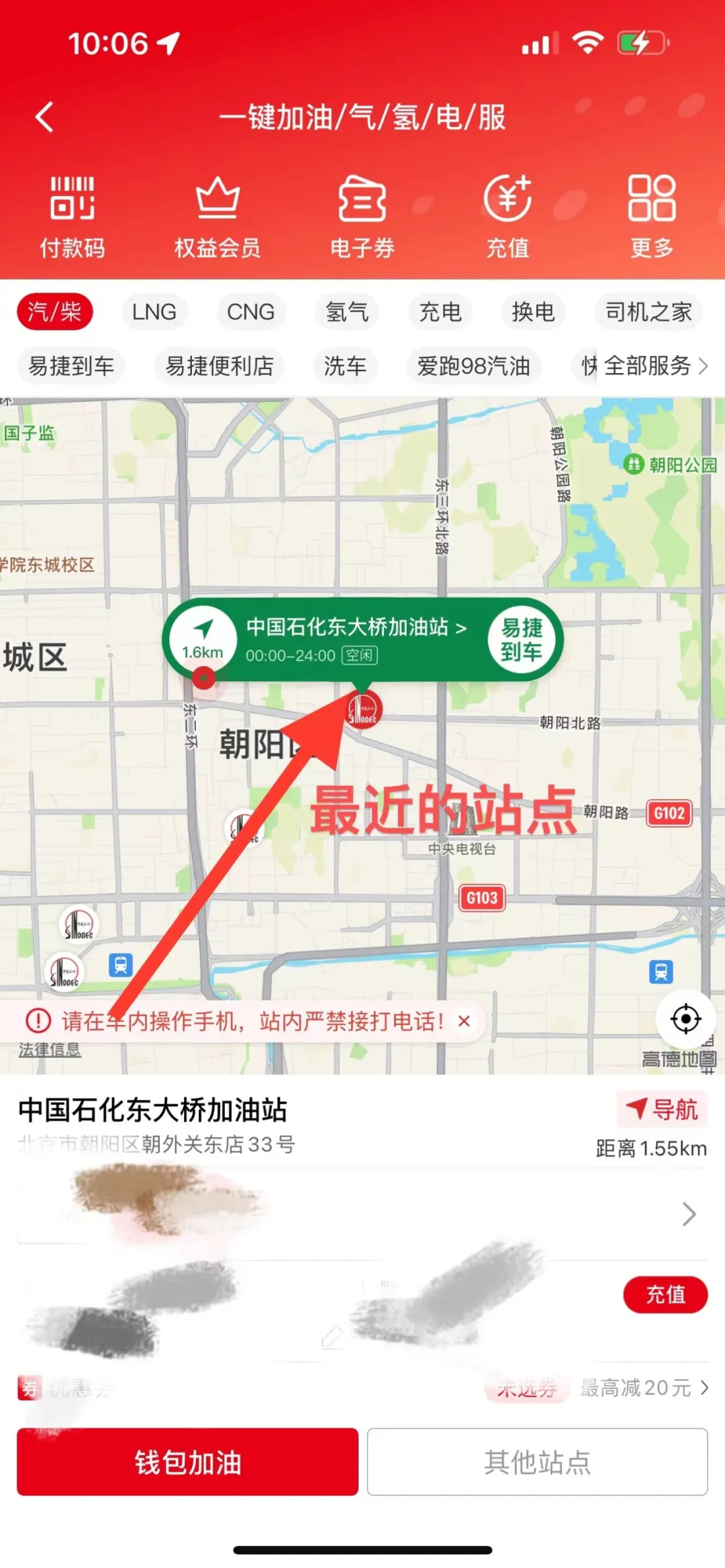 屏幕将显示离您最近的中国石化加油站