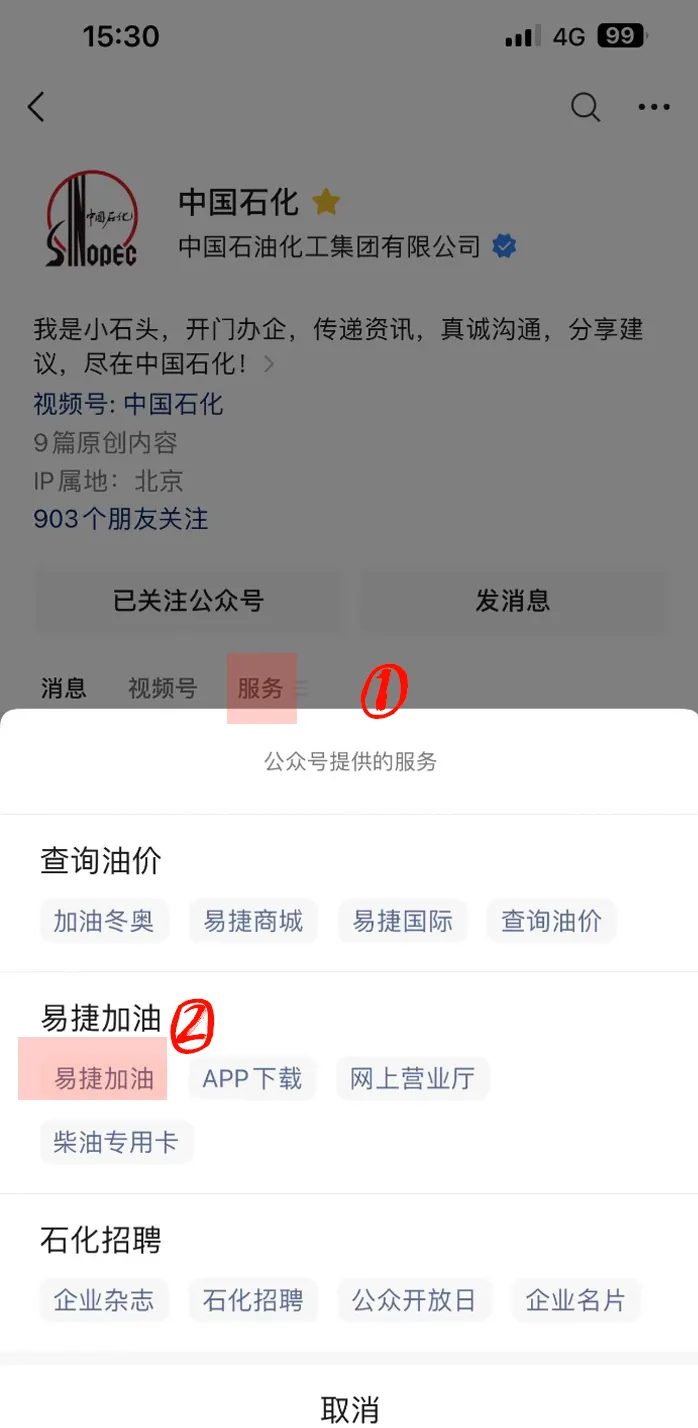 若不确定加油站是否正规,可关注“中国石化”微信公众号,点击菜单“服务”—“易捷加油”,快速查找附近的正规站点。
