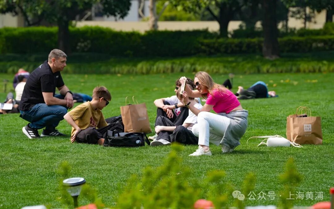 草坪上,三三两两的人们或坐或卧,中外友人融洽相处,都在这片绿意里放缓了脚步。