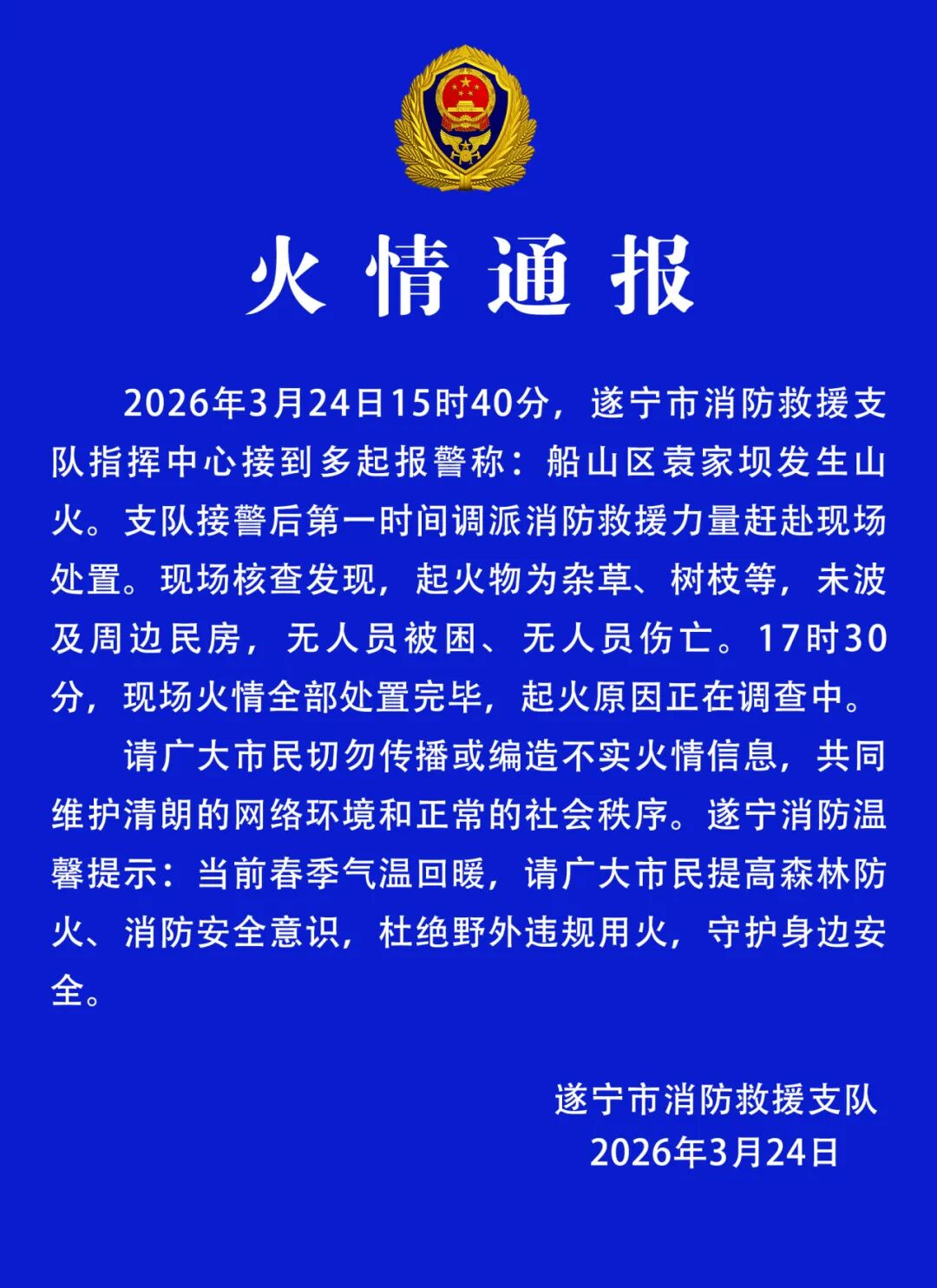 事发后,辖区公安等部门第一时间全面摸排走访,确定袁家坝居民杨某坤因违规野外用火引发火情。目前相关行政部门正开展调查,其行为违反《遂宁经济技术开发区2026年森林防火命令》,后续将依法依规严肃处理