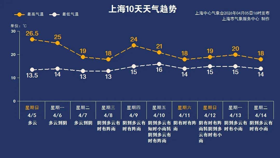 节后第一个工作日,上海天气为多云到阴,气温有所下降,在13~19℃之间。从本周三开始,西南暖湿气流逐渐活跃,上海将迎来多次降雨过程。整体气温波动不大,维持在13~24℃。春季天气变化较快,昼夜温差也较大,提醒大家及时关注最新的预报预警信息,合理安排生活与出行。