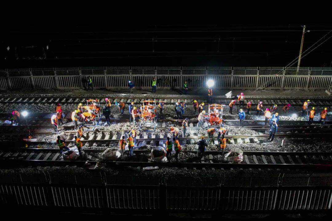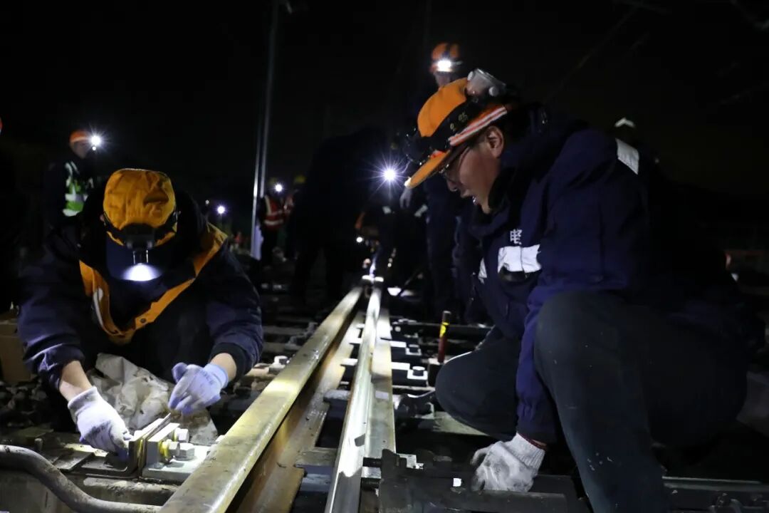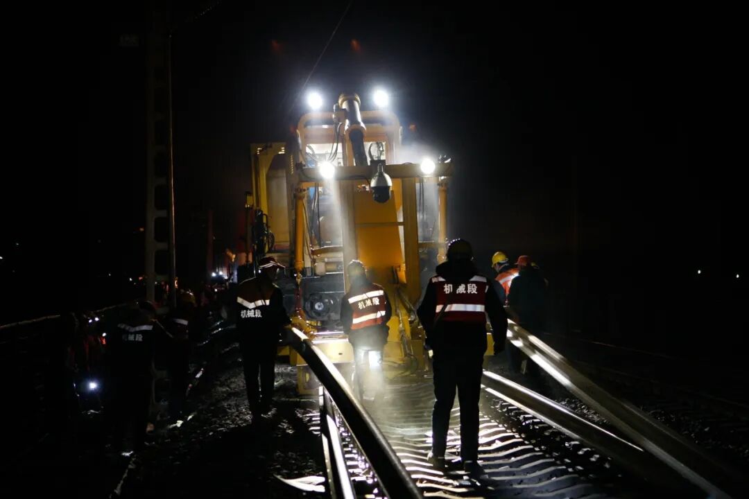 职工对新更换的道岔道床进行捣固作业。刘增虎 摄