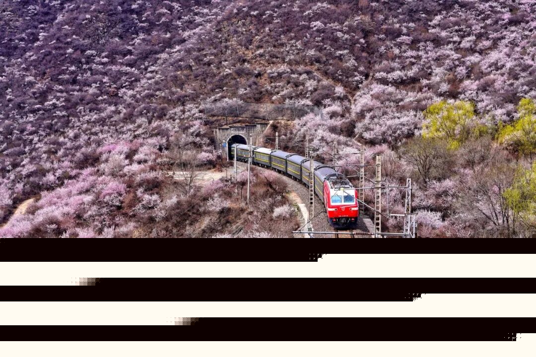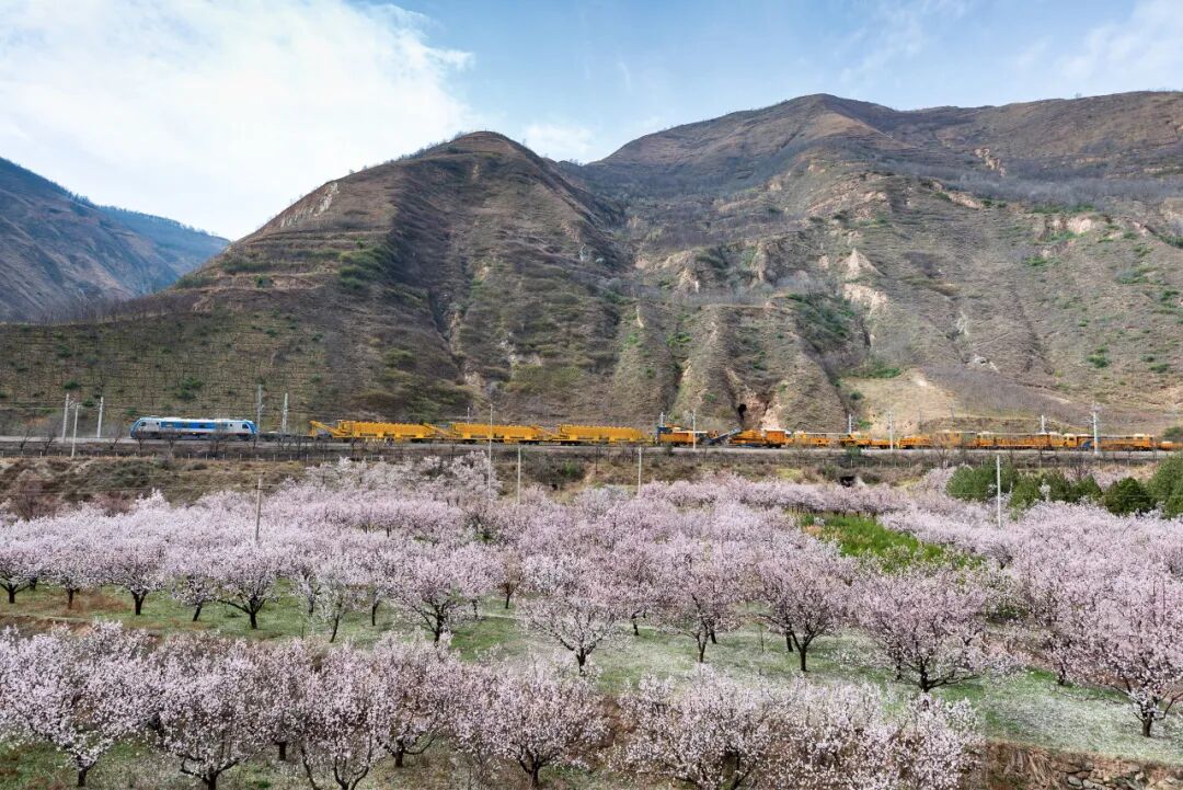 宝中铁路上的公益性“慢火车”穿梭在烂漫山花间。曹文福 摄