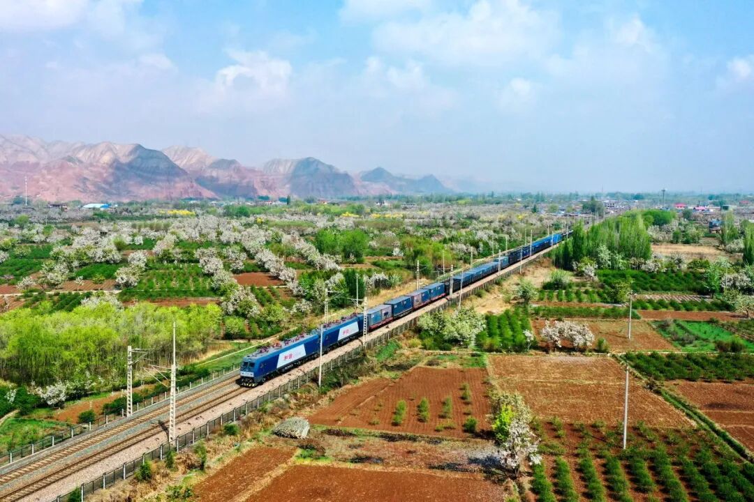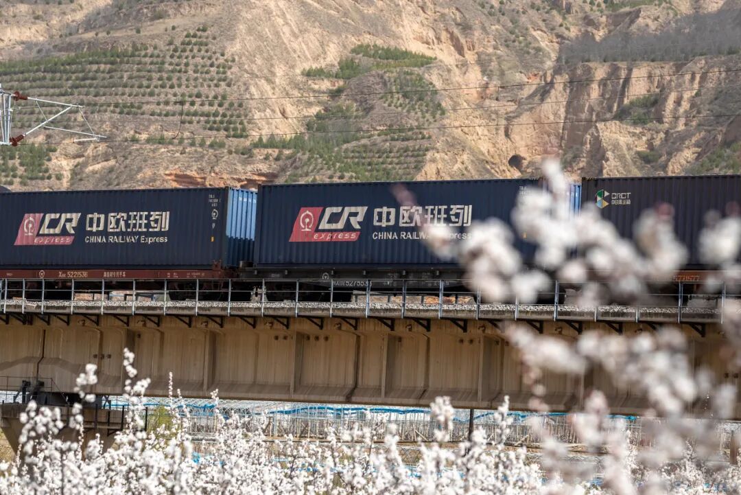 陇海铁路上的中欧班列穿行于花海间。刘增虎 摄