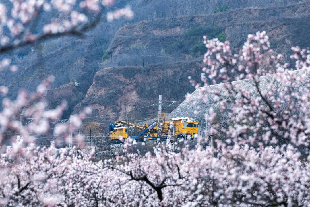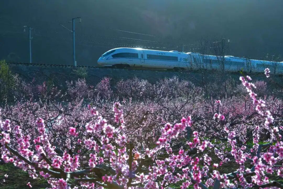 行驶在徐兰高铁天水段上的动车组列车与桃花相映成趣。陈健 摄