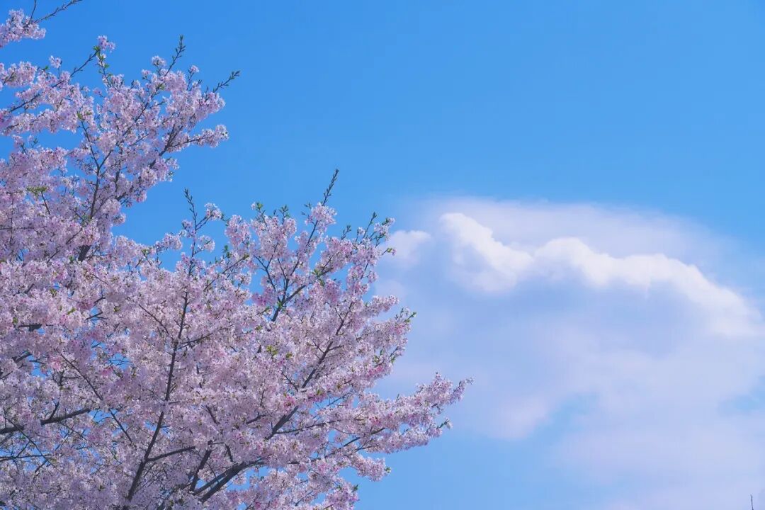 春日的天空格外澄净,天蓝得透明纯粹,映在湖面便成温柔碧色,映在远山后更衬山色深黛,映在花后则添几分梦幻浪漫。