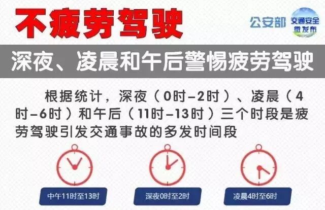 深夜、凌晨及午后时段需格外警惕疲劳驾驶。疲劳会影响驾驶人的注意力、感知力和判断力,导致反应迟钝、判断失误、操作错误增多,严重时甚至会失去对车辆的控制。