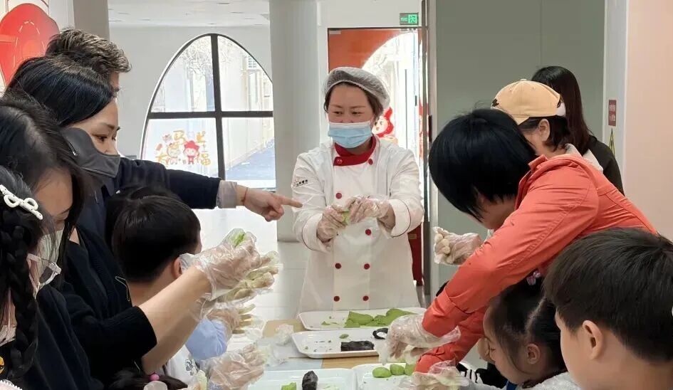 “揉一揉、捏一捏,馅料别放太多,收口要紧实……”谨斜居委会的社区食堂内暖意融融。食堂师傅端来新鲜翠绿的艾草汁、细腻的糯米粉,还有香甜的豆沙与咸香的肉松馅料,围在案板旁教居民包青团。年长的阿姨们手法熟练,主动当起“老师”,带着新手揉粉、裹馅、搓圆,边做边聊家常。另一边,天龙、宛南“生活盒子”里亲子搭档十分热闹,爸爸妈妈牵着孩子的小手,跟着师傅学习调配粉团、融合艾草汁,稚嫩的小手跟着大手慢慢揉捏,一个个圆滚滚的青团成型,藏着春日的清甜,也裹着亲子间的温情。