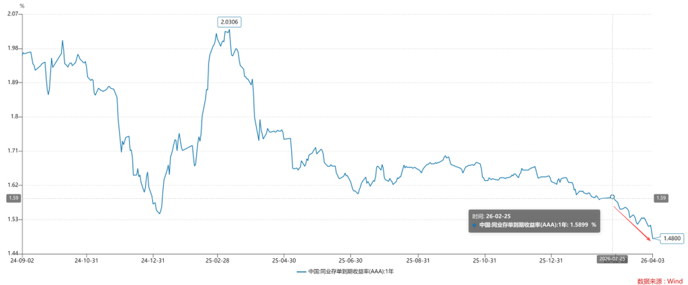 按照传统理论,国内货币宽松空间应十分有限,甚至央行需收紧货币政策。但实际情况是,央行逆势降息约10个基点,一年期存单利率从2月底的1.59%降至当前的1.48%,具体数据见下图。