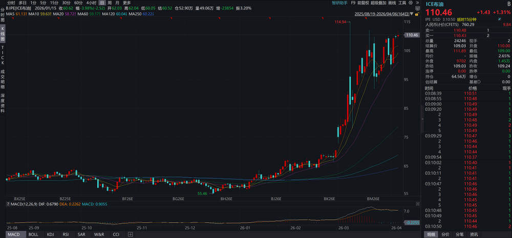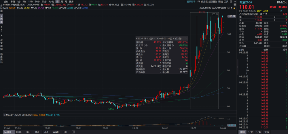 美以伊冲突已持续35天,国际原油价格高位运行,布油价格已突破110美元/桶关口,具体走势如下图所示。