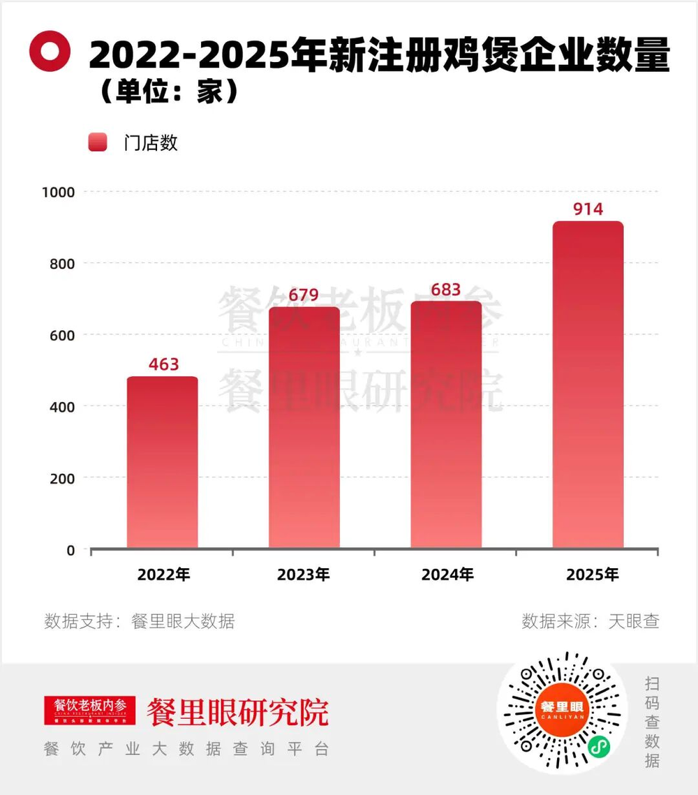 鸡煲的火爆催生了一批新兴连锁品牌。截至2026年3月,名称含“鸡煲”的在营餐饮企业达4881家,多数为近三年新增。2022—2025年,鸡煲相关企业新注册量连续四年增长,从2022年的463家升至2025年的914家,赛道扩容明显。