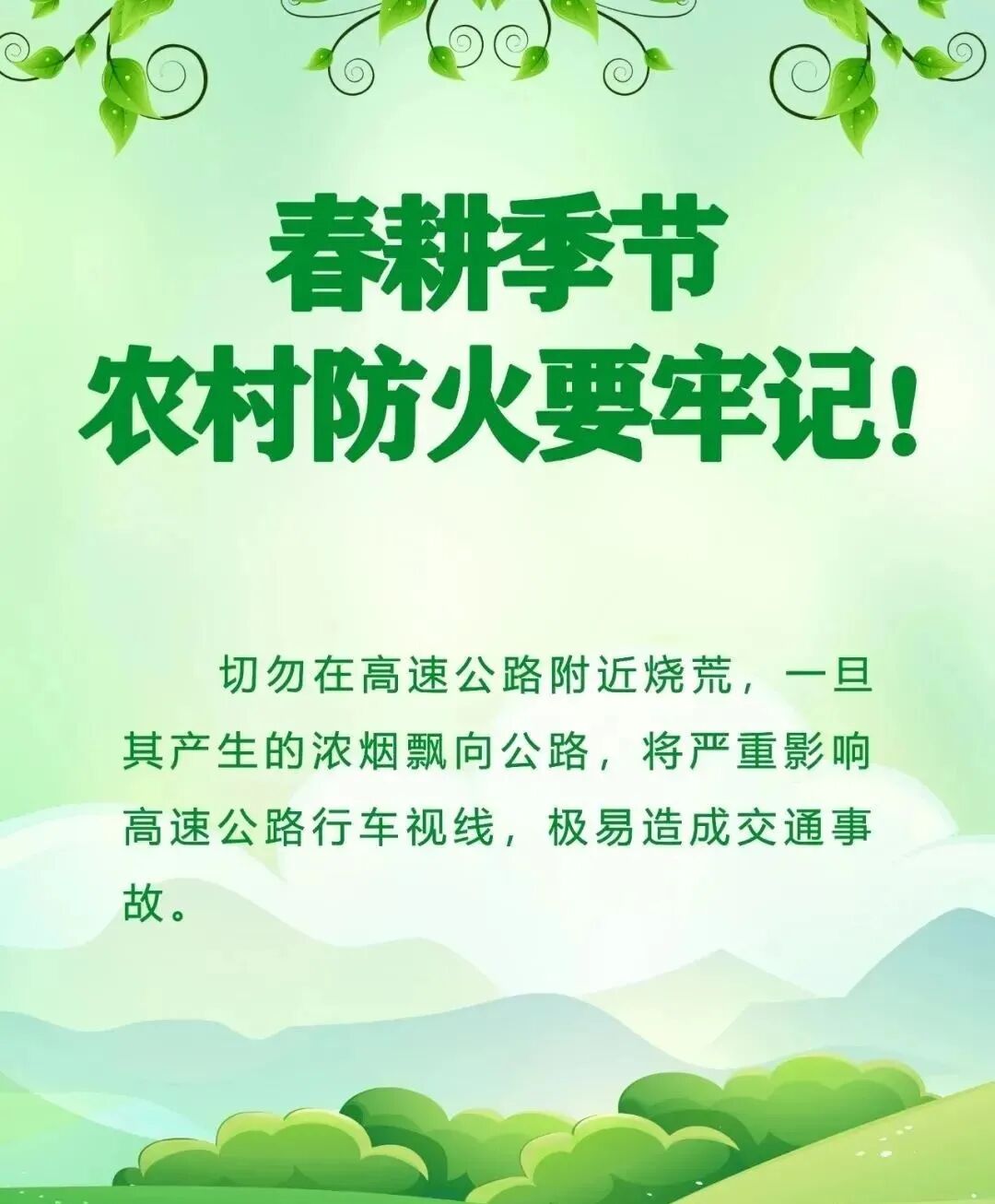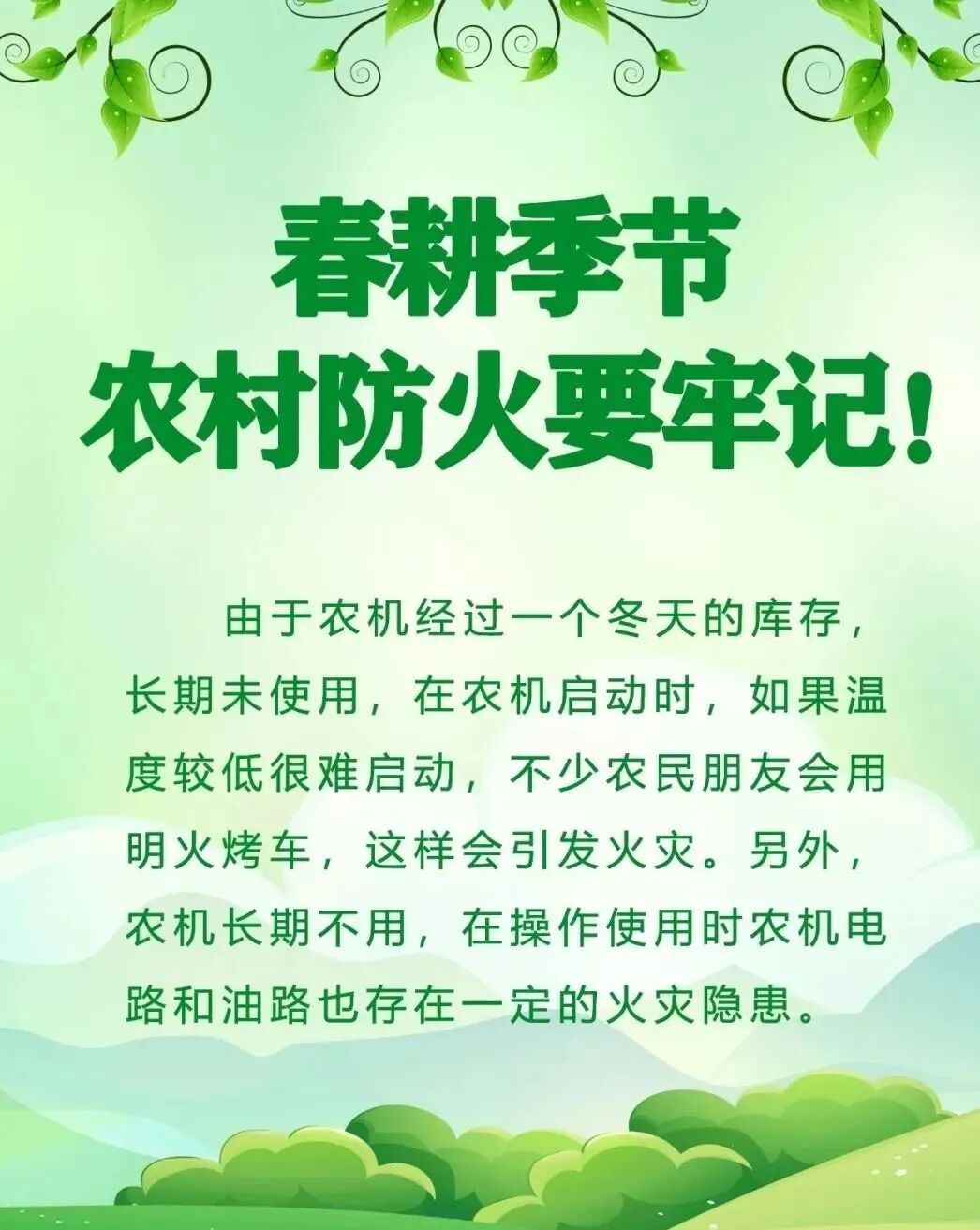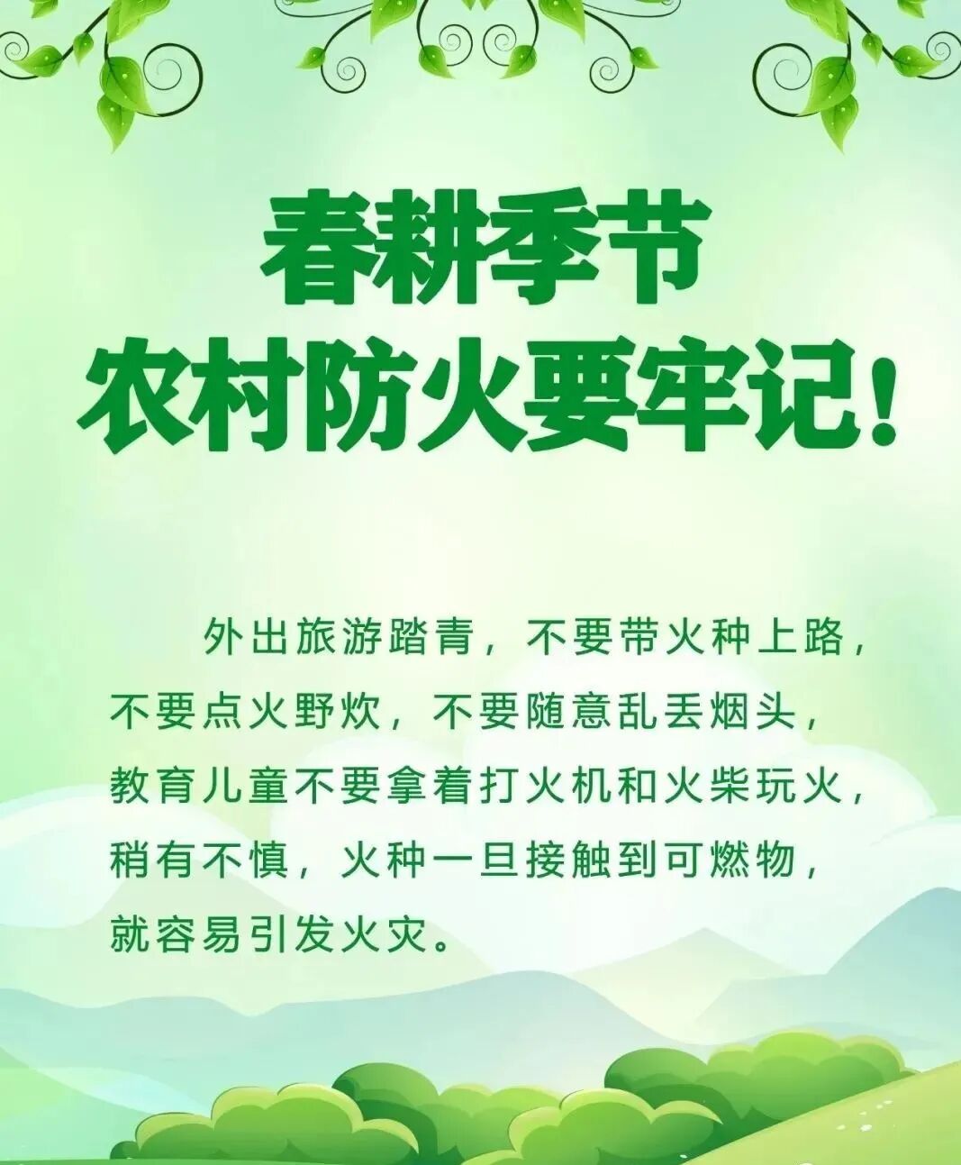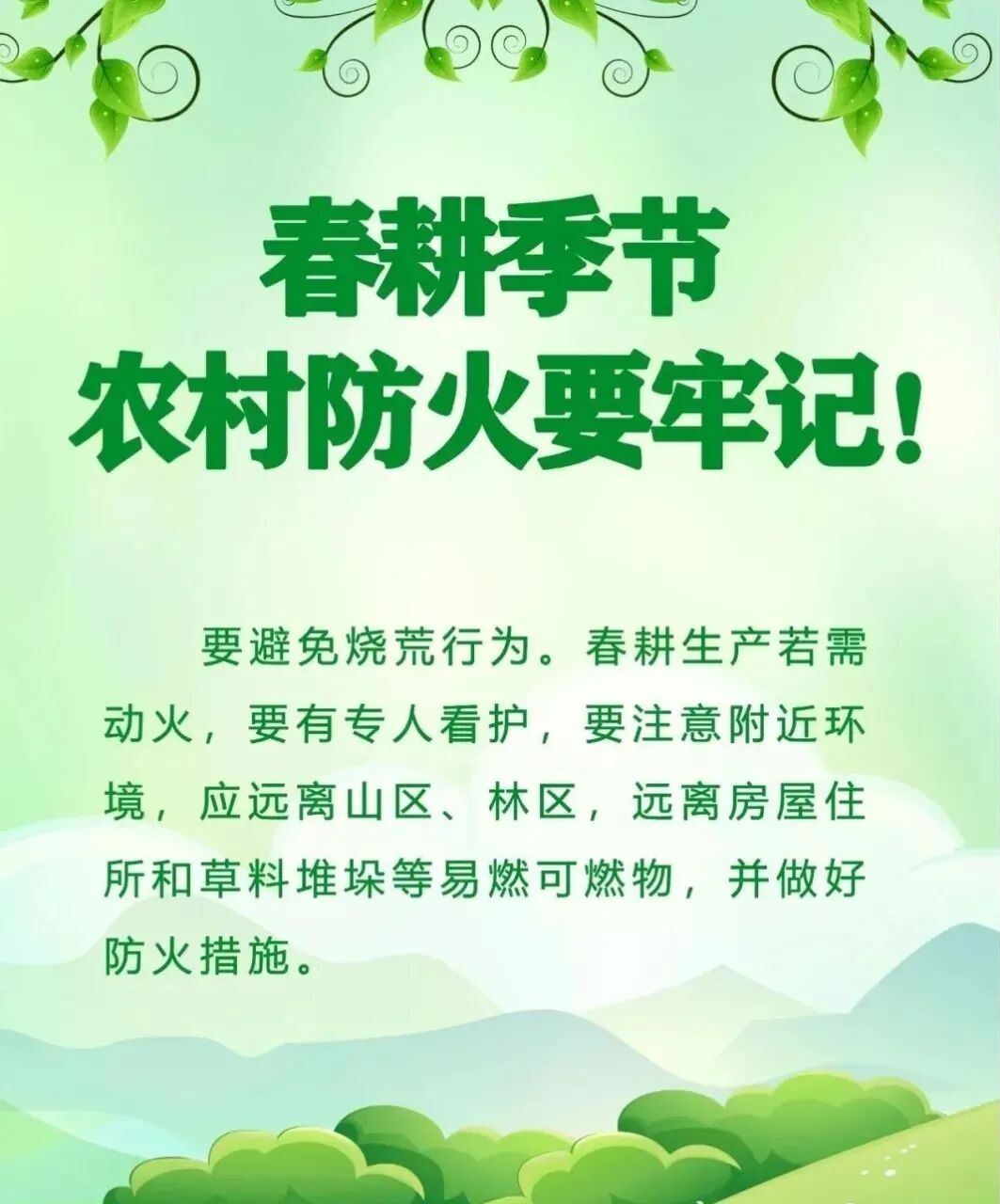 一、尽量避免烧荒。春耕若需动火,必须安排专人看护,注意周边环境,远离山区、林区、房屋住所和草料堆垛等易燃物,并做好防火措施。