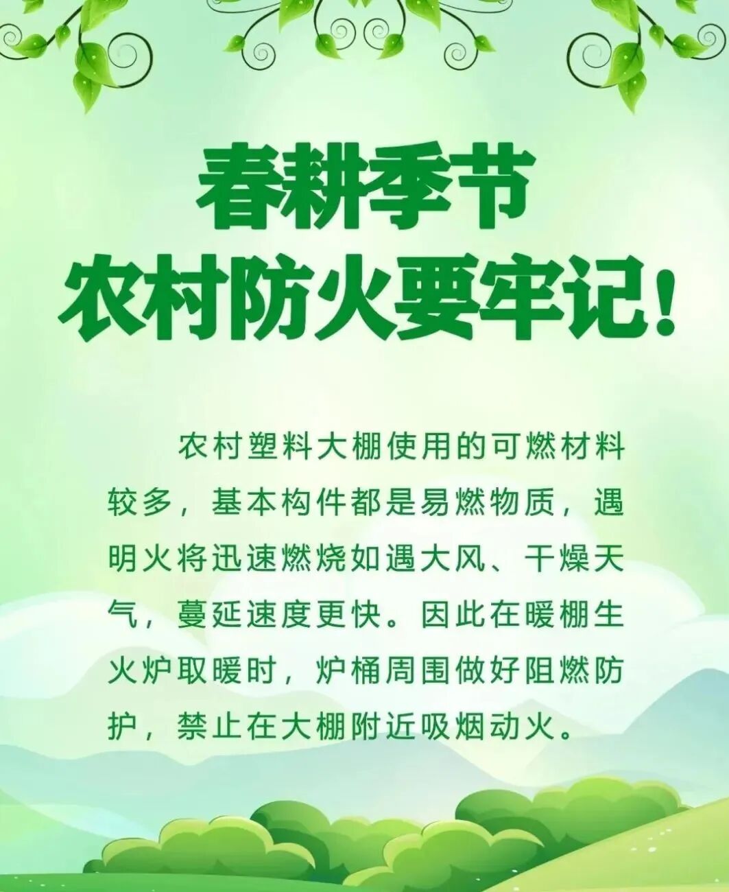 五、农村塑料大棚多使用可燃材料,遇明火易迅速燃烧,大风干燥天气下蔓延更快。暖棚生火炉取暖时,炉桶周围要做好阻燃防护,禁止在大棚附近吸烟动火。