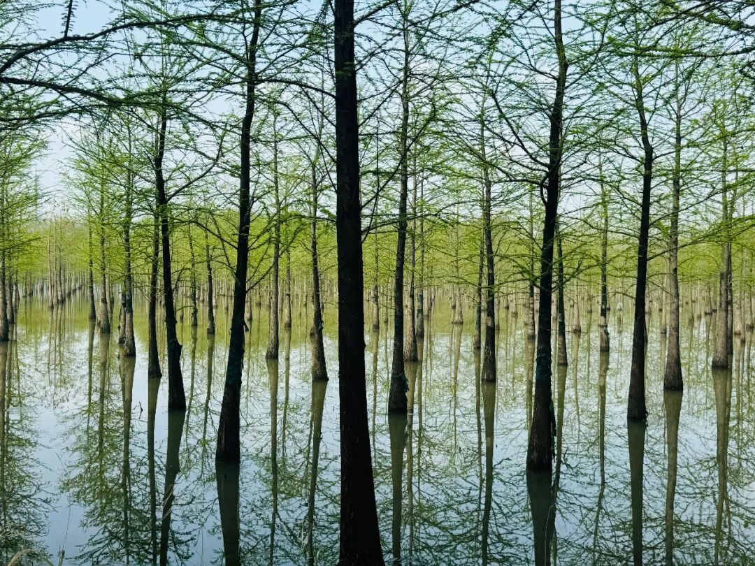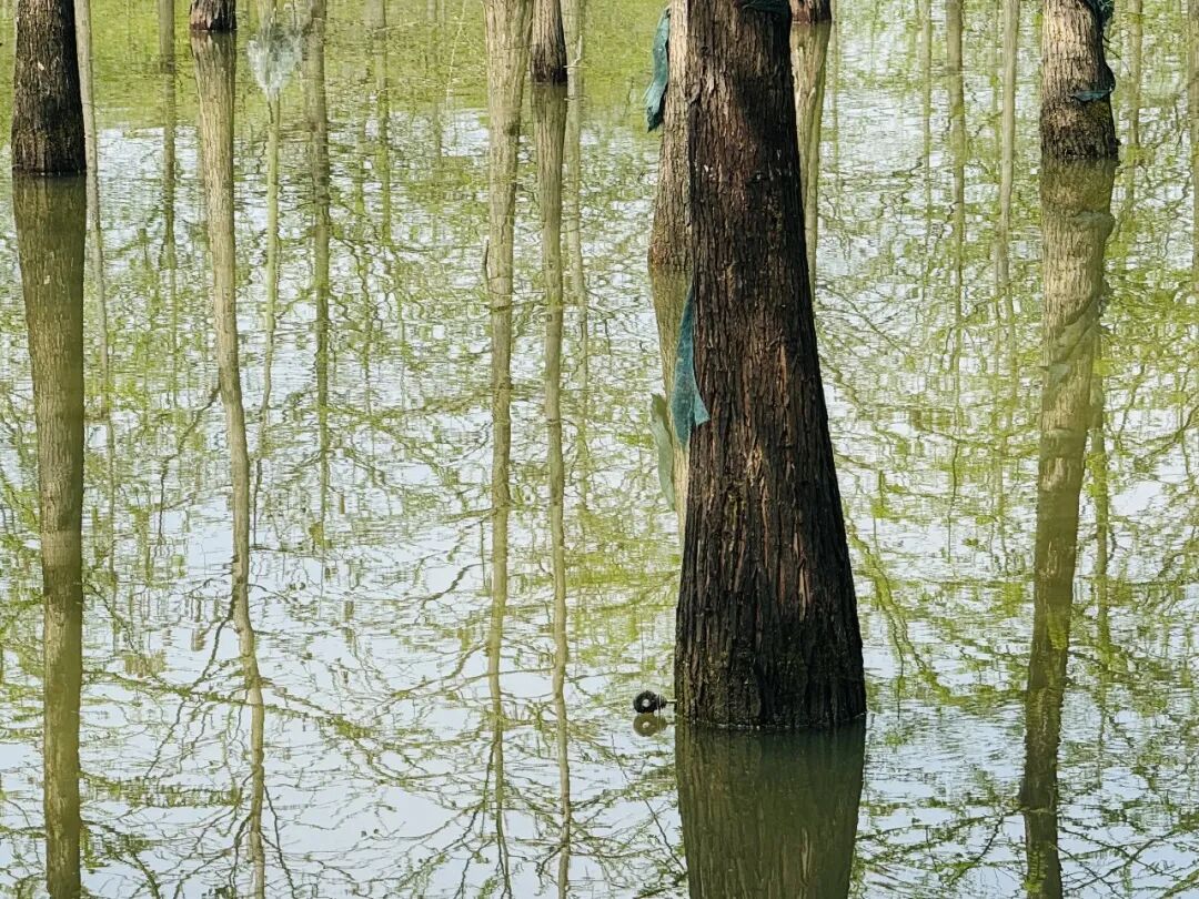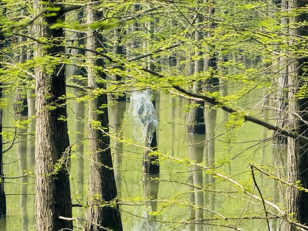 然而,当记者沿着滨水区域仔细查看时,在水面上发现了地笼网,网体半浮在水面,看起来已经存在了不短的时间,水中央的水杉树上还挂着破旧的白色网线。