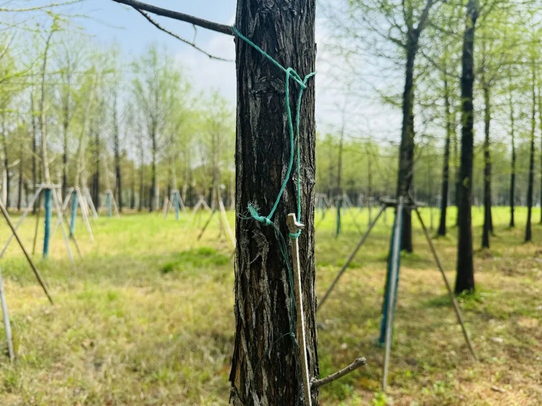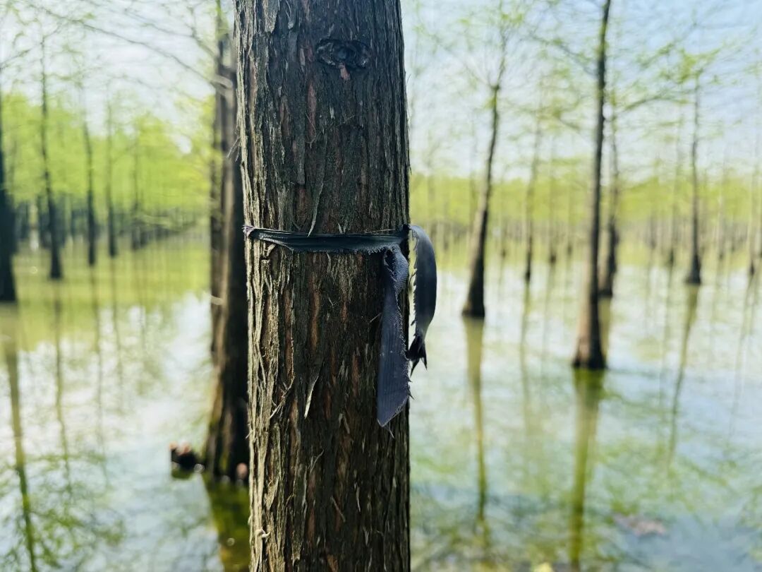 在岸边的树上,记者也有了发现。一棵树上挂着残留的捕鸟网,旁边几棵树上还留有木条、布带和麻绳等物品,从侧面证实了曾有人在此放置捕鸟网,试图捕捉野生鸟类。