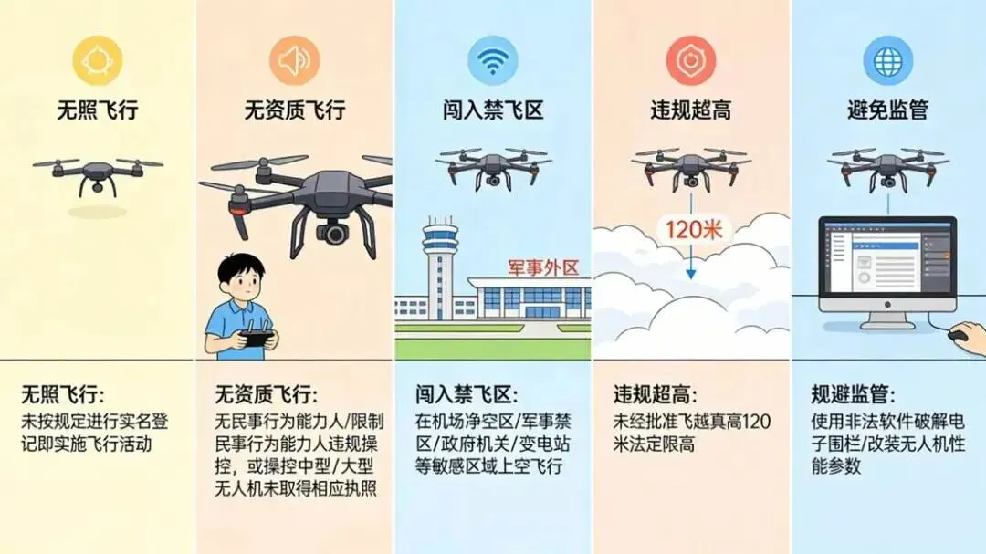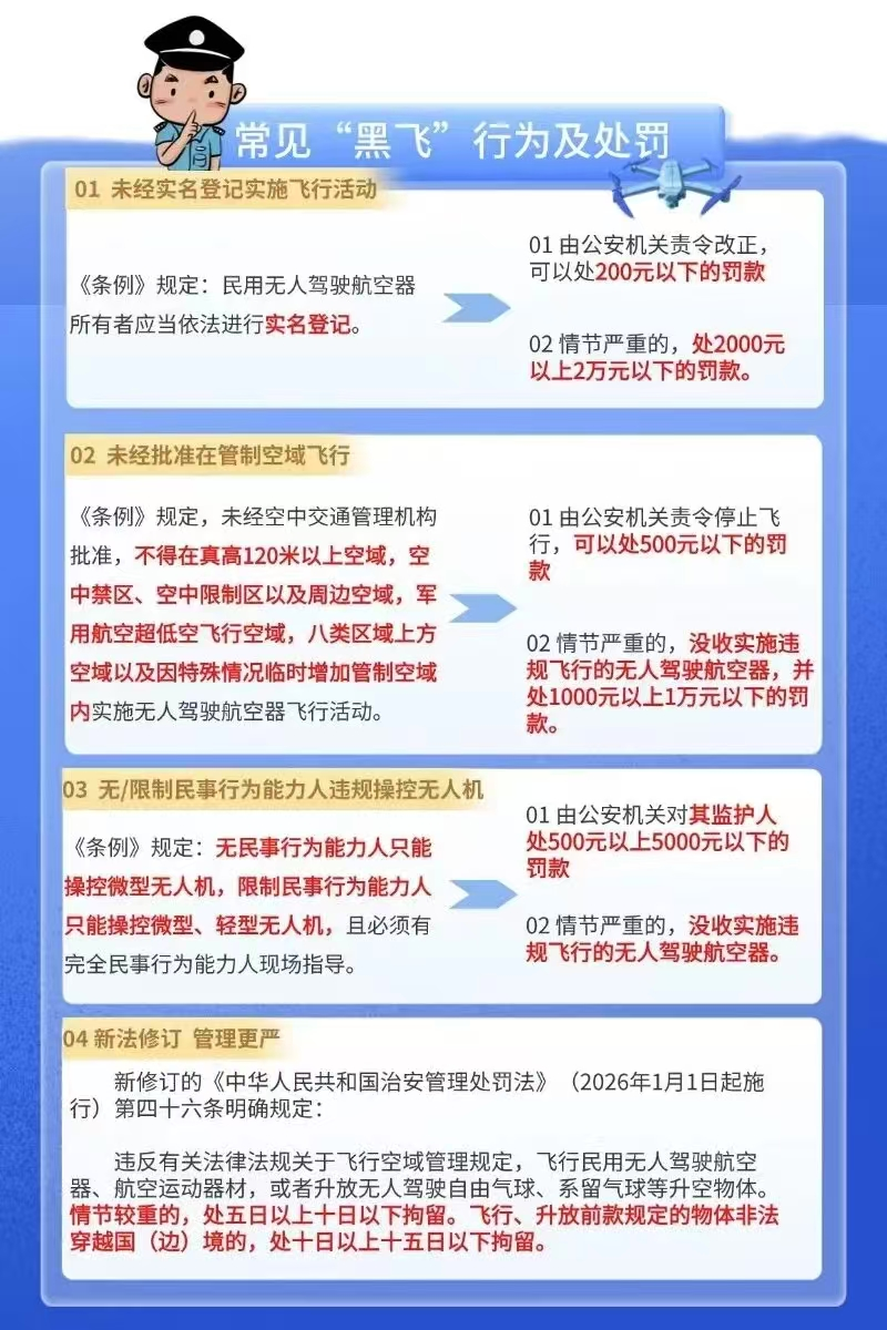 “黑飞”是无人机违规飞行的通俗说法,指的是所有违反国家空域管理、航空管理、治安管理等相关法律法规的飞行行为。