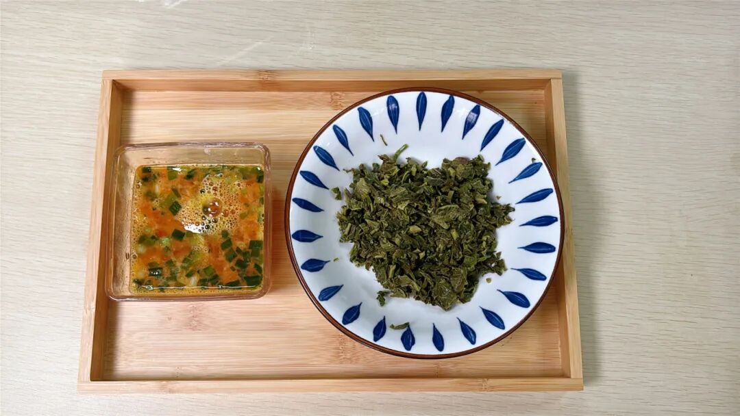 1. 将香椿焯水后过凉水,挤干多余水分并切碎。