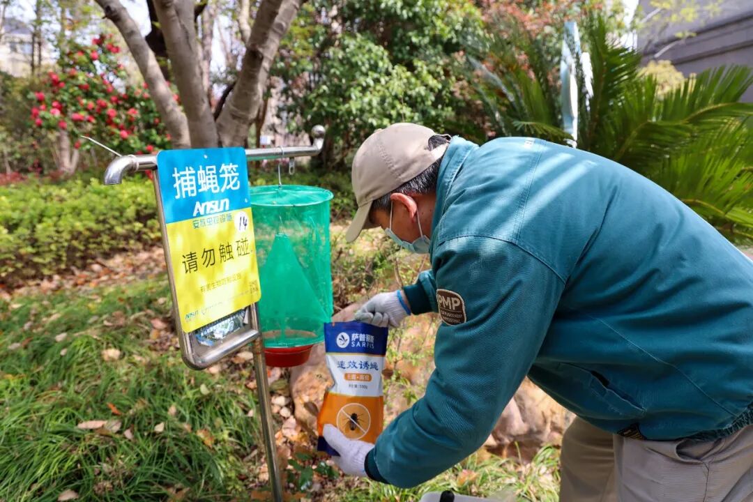 4月1日上午,记者来到朱泾镇万祥金邸小区,看到绿化带里挂着捕蝇笼。工作人员正在仔细检查笼内的诱蝇饵料,确保每个捕蝇笼都能正常发挥作用。