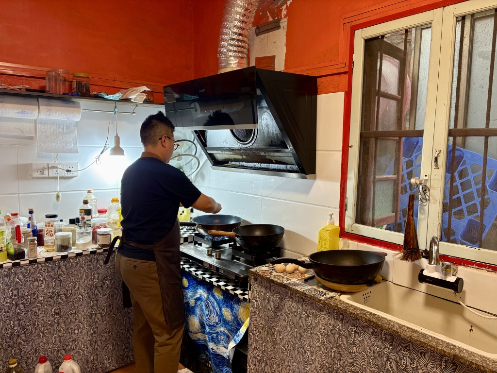 没聊几分钟,有客人进店。理论上商老板一个人要忙全部事务,当天她的一位朋友也在,能帮忙。商老板招呼我进后厨,边忙边聊。一进去,满眼锅碗瓢盆、食材调料,四口锅可同时烹饪,热爱做菜的人大概会很满足。
