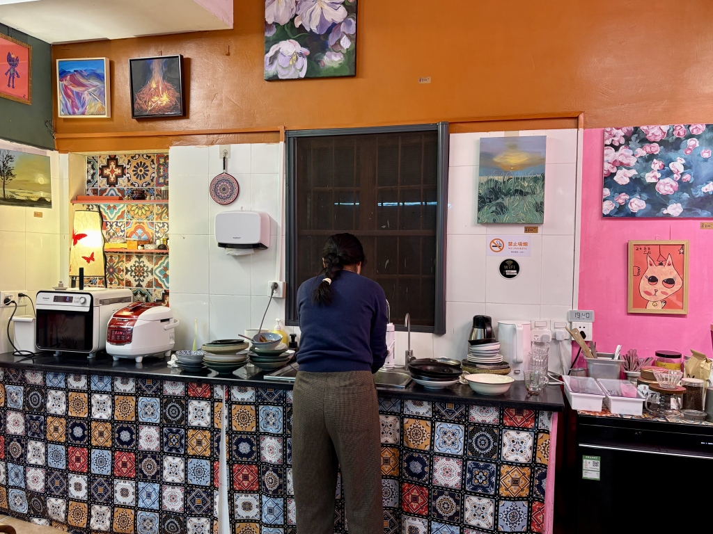 不知何时,良吉面包店的大哥已在厨房默默干活,洗了碗筷、擦了灶台水池、把番茄酱放回冰箱、扔了蔫茄子。“大哥眼里有活!”面对朋友夸赞,他只淡淡说“我们很熟了”。商老板炒菜间隙塞给他小礼物,他说“不缺”又放回桌上。厨房中央的大桌原本摆满东西,他收拾后把厨具排成一列,说“实在看不下去”。面包店的另外两位女士也在洗碗。快到晚上8点,还有一桌客人在吃饭喝酒,菜都做好了,堆高的碗碟也洗好了,大家才放松下来。