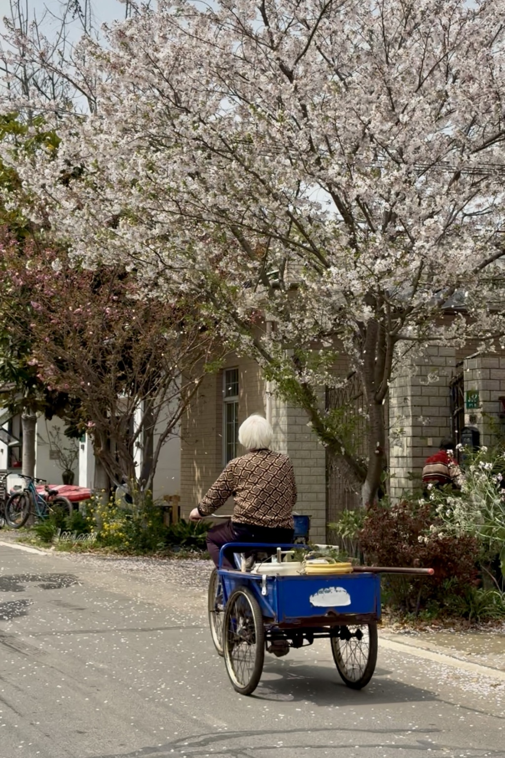 我也放慢了脚步。风吹过樱花树,花瓣纷飞如雪,路过的人都成了风景;一家仿古风格的老茶馆关着门,却“安排”了木雕狗看家;俯身看去,路边亮黄色的猫爪草、蓝色的阿拉伯婆婆纳、紫色的宝盖草正竞相开放,小巧而美丽。