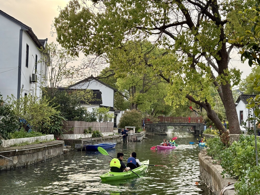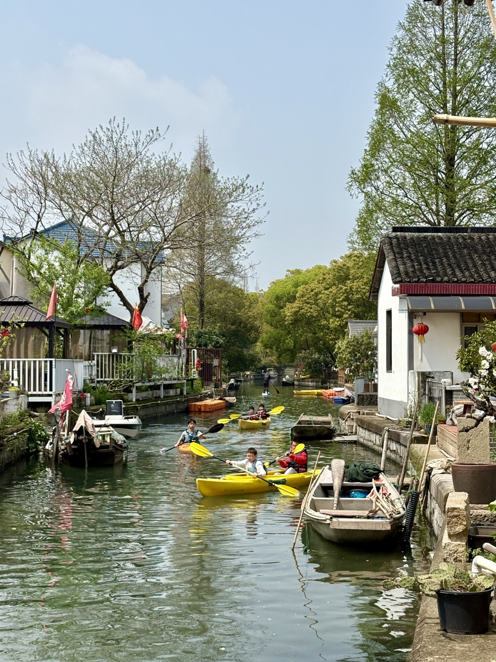 眼前,小河浜穿村而过,有些年头的木船停靠岸边,4名孩童在教练指导下划起皮划艇。村里多是外观朴素的二层小楼,门前有人晾晒衣物,旁边偶尔有几盆随意生长的盆栽,几只散养的鸡,还有零散分布的菜地。沿途也有一些精致的小院,是咖啡馆、餐厅、民宿,路口还有几家皮划艇俱乐部,提醒着这里已不是传统意义上的乡村。