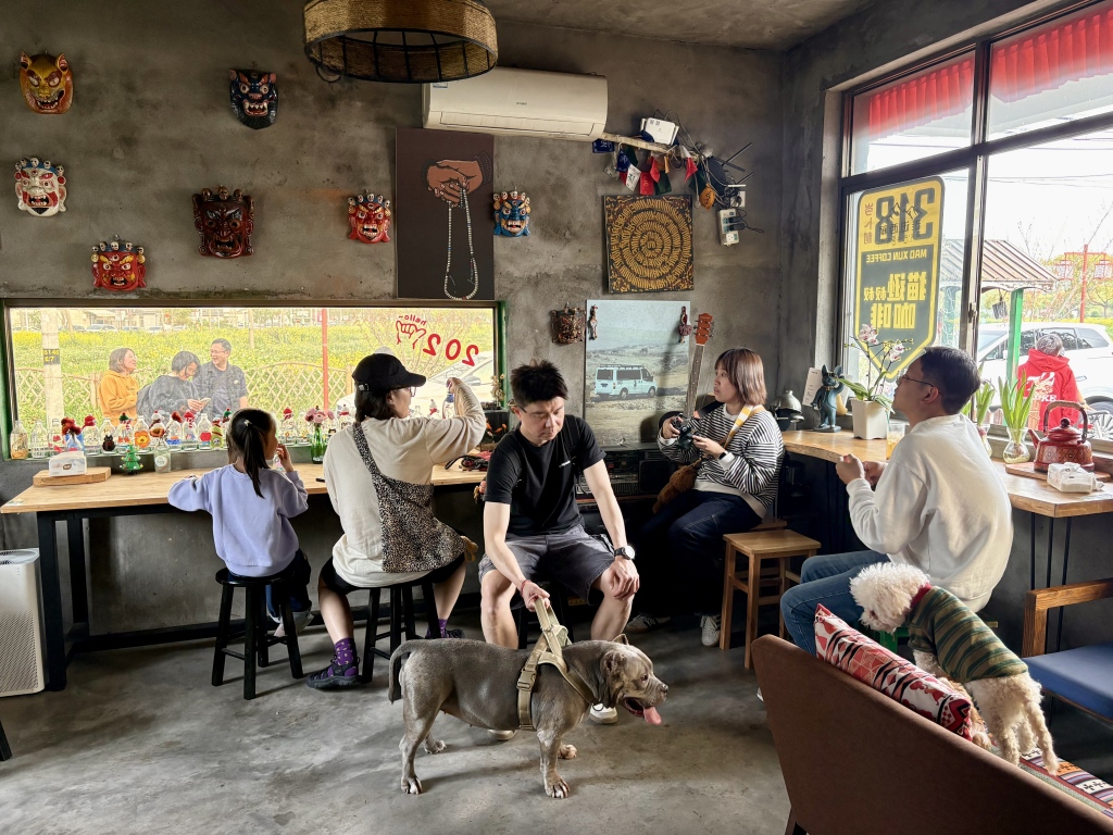 一群骑车的年轻人在猫逊叔叔咖啡店前停下。门店外墙满是涂鸦,内部毛坯墙上挂着照片、藏戏面具,桌布沙发套是藏族氆氇。30岁的王广宇忙着做咖啡,他说合伙人来自四川甘孜,审美独特,才有了现在的装修风格。