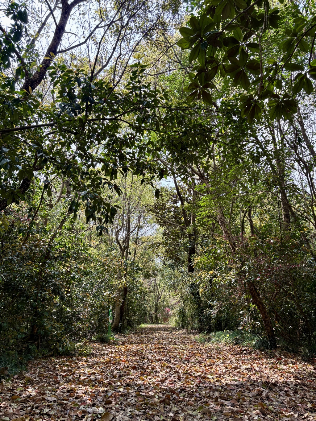 在乡村追求自然变得简单,萤火虫基地突然映入眼帘,前面的游客大喊“哇好好看”。密林中开辟出几条小径,两侧树木高耸,枝叶交错生长,保持着原始状态,大红色的山茶花在绿叶间格外醒目,像是自然的惊喜馈赠。指示牌介绍,岑卜村西侧500余亩森林是黄脉翅萤的繁衍地。眼下虽不是萤火虫季节,但踩在落叶小径上簌簌作响,能感受到前一天大雨留下的湿润,听着林间鸟鸣,也是一种美妙体验。