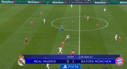 比赛第41分钟,维尼修斯传球失误,拜仁抓住机会发起进攻,格纳布里送出直塞,迪亚斯推射破门,拜仁客场先下一城。
