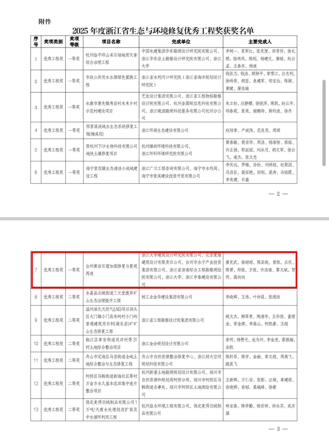近日,浙江省生态与环境修复技术协会发布浙生环协工〔2026〕2号文件,正式揭晓2025年度浙江省生态与环境修复优秀工程奖评选结果。