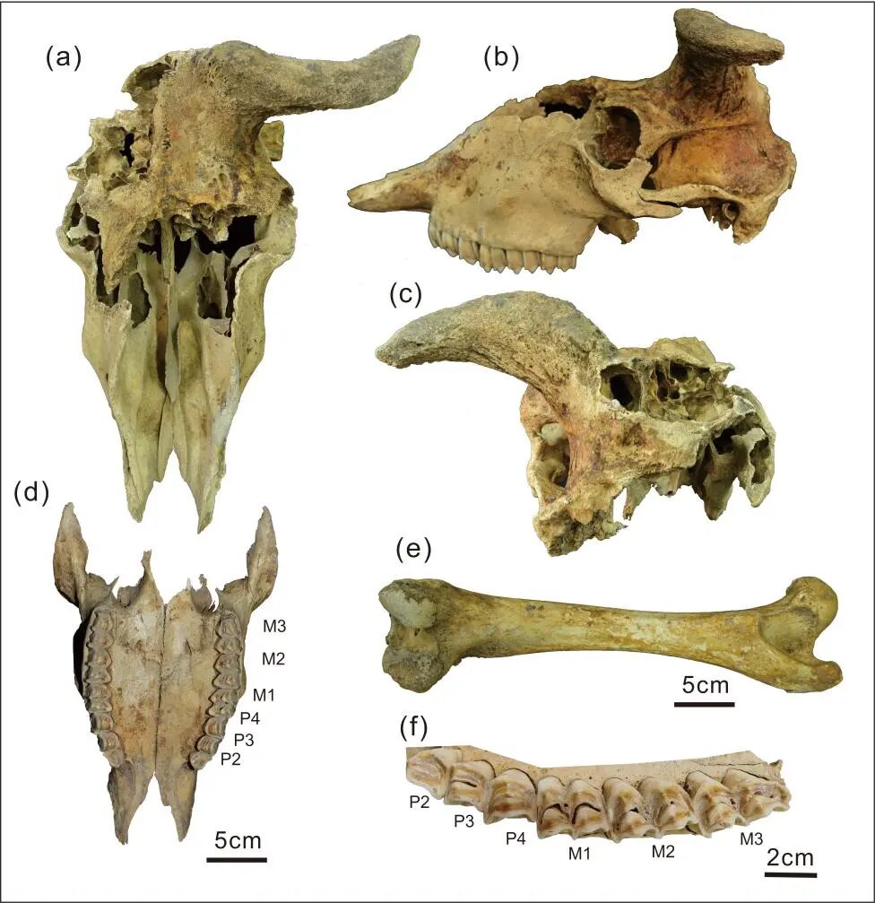 之后,科考团队对周边的沉积环境进行了进一步的清理与辨识,又在距离该标本大约20米的地方发现了另一具个体化石。经过形态测量、年代学测定以及系统分类分析确认,这两具化石都属于羚牛,分别是1头未成年个体和1头成年个体,它们都来自晚更新世晚期,距今大约1.5万年和1.1万年。