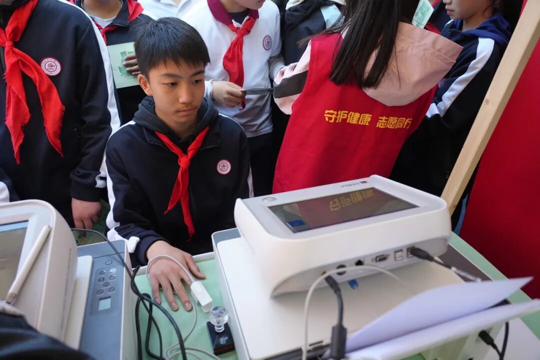 在“压力解码站”,九年级3班的钱一诺在志愿者指导下戴上指夹传感器,静坐3分钟后拿到专属压力报告。该报告通过心率变异性监测,清晰呈现自主神经调节能力、压力状态及疲劳指数等内容。