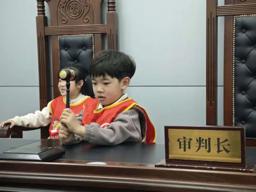 随后,师生们来到审判法庭。少年庭庭长张丽亚结合幼儿的认知特点,细致讲解了法庭布局、法徽、法槌、法袍的含义与作用,并普及基础法律知识。为增强体验感,张丽亚邀请小朋友们走上审判席,沉浸式扮演“小法官”“公诉人”“辩护人”,亲身感受司法的庄严与权威。