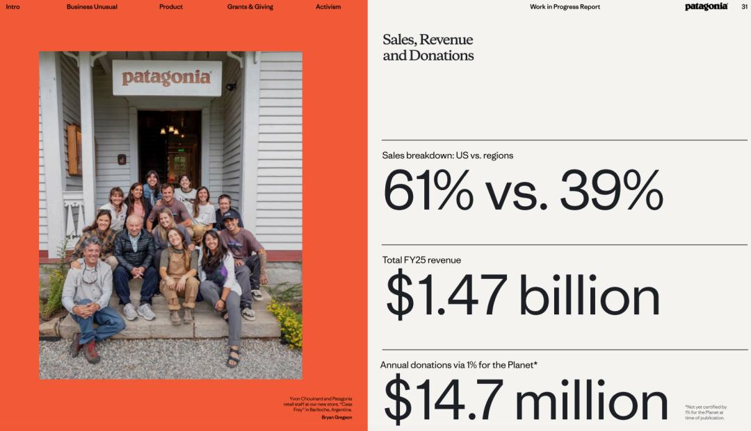 Patagonia环保人设全球硬核:1985年起捐1%销售额给地球;2022年创始人将30亿美元公司股份转入信托和非营利组织,称“地球是唯一股东”;2024-2025财年销售额14.7亿美元,捐1470万美元支持环保。