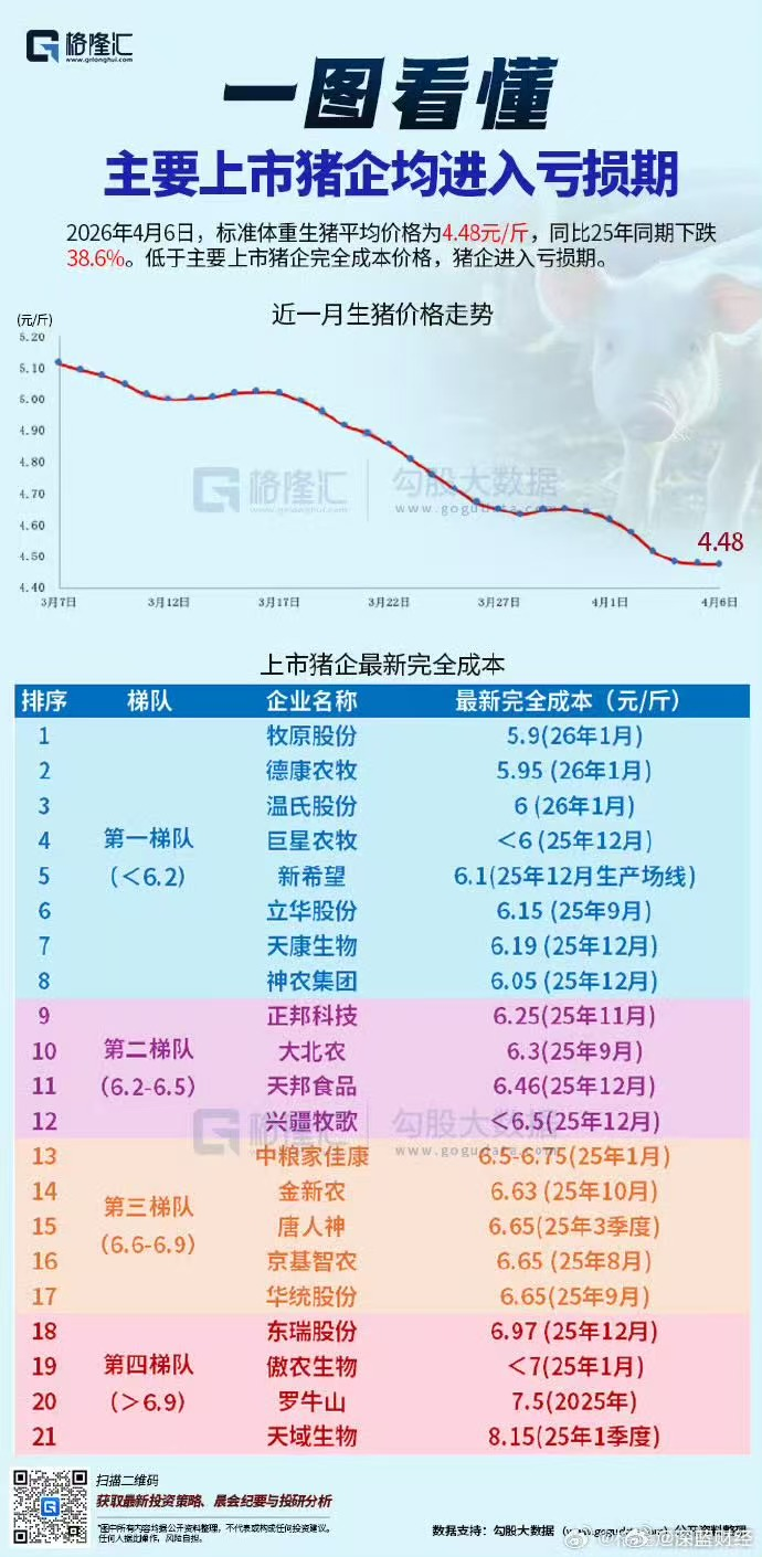 4月6日的最新数据显示,标准体重生猪平均价格为4.48元/斤,较2025年同期下跌38.6%,创下近八年来的最低纪录。