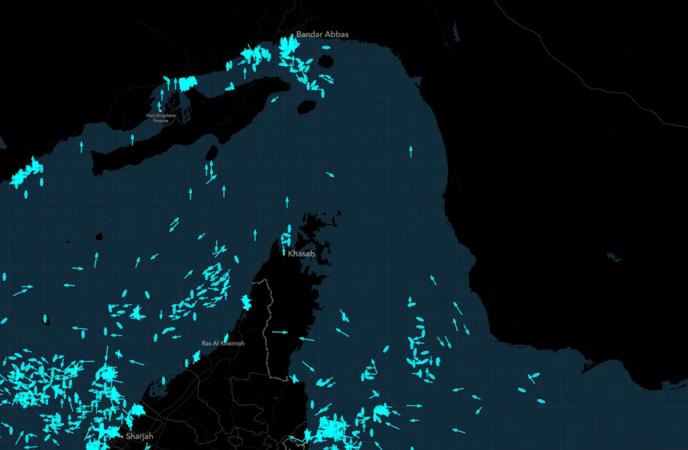 周三上午,各类船只聚集在霍尔木兹海峡两岸、波斯湾迪拜附近以及阿曼湾的霍尔费坎港。