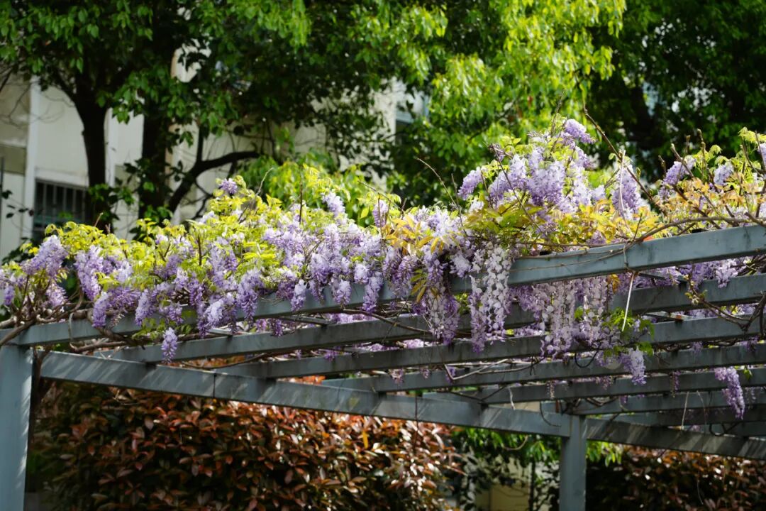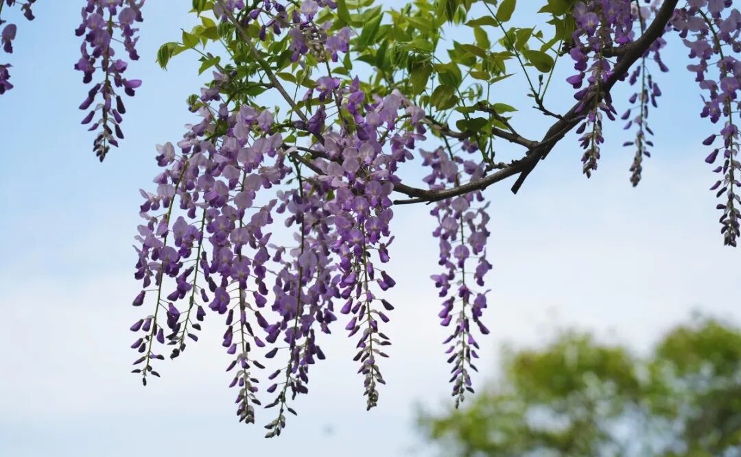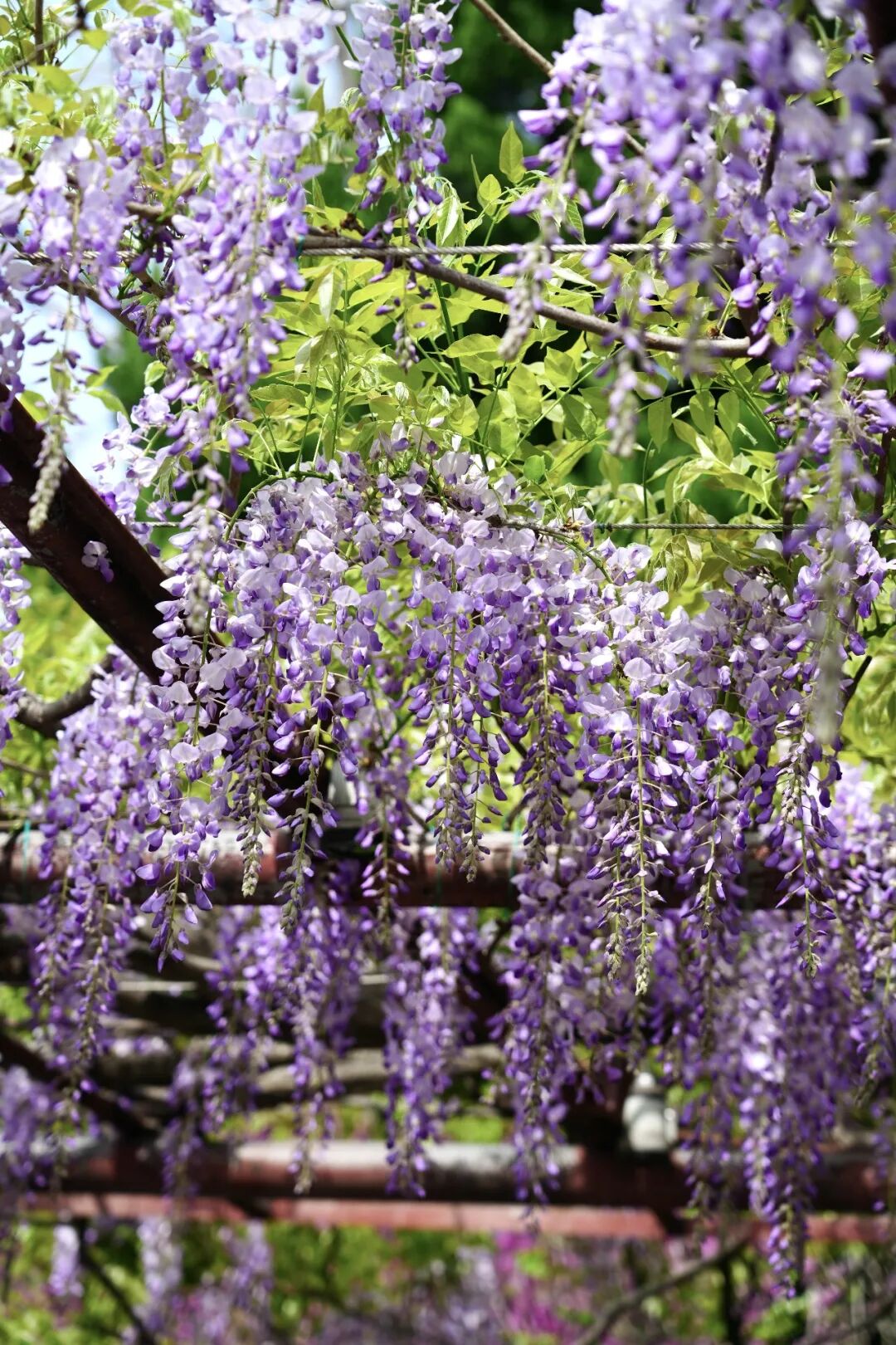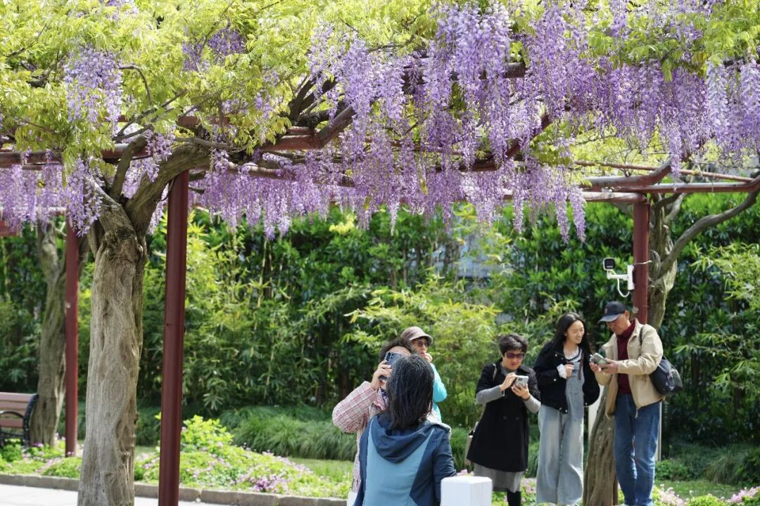 在嘉定紫藤园内,第一波紫藤也已盛开。一串串紫色花穗挂在绿叶藤蔓间,轻柔如流苏。微风吹过,花穗轻轻摇曳,淡淡的香气弥漫开来,让人心情舒畅。