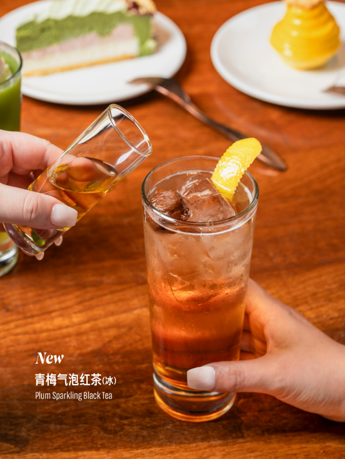 青梅气泡红茶以武夷山松山正山小种为茶底,加入青柠气泡水,用紫苏风味丰富口感,再添少许梅酒,梅酒入茶,回味无穷。