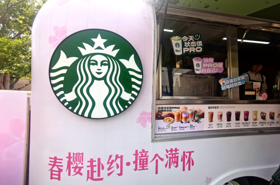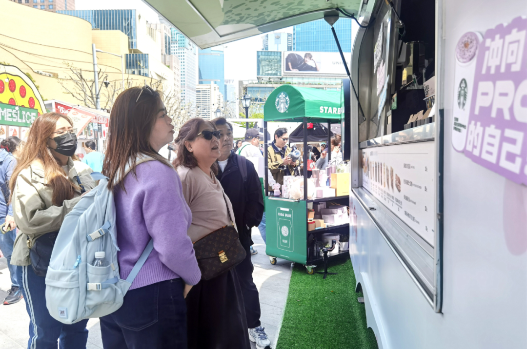 在丰盛里·静安寺广场的市集主会场,一辆装饰着粉色樱花的星巴克移动咖啡车十分吸睛,造型可爱又充满春日气息。