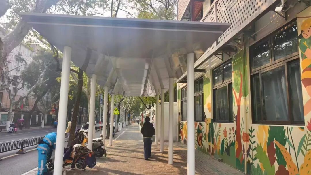 在密云路与玉田路的路口新增了景观廊架,既为家长提供了遮阳避雨的等候空间,也有效引导了人流秩序,缓解了高峰时段的拥堵问题。