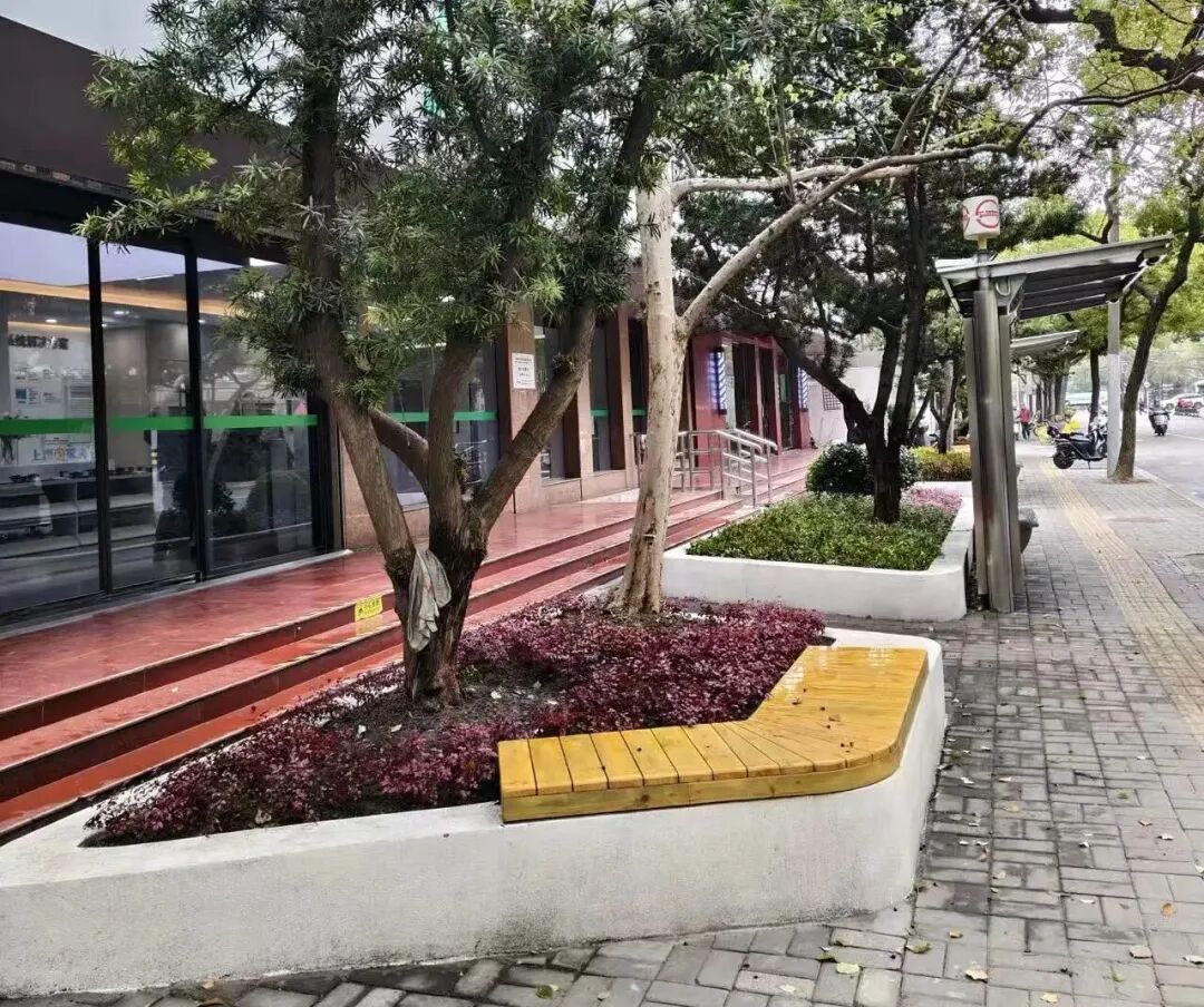 设计了多边异形种植池,斜边向内聚合的形态自然引导行人流向商铺,增强了商业界面的吸引力。临街一侧增设座椅,兼顾了候车与休憩的需求。