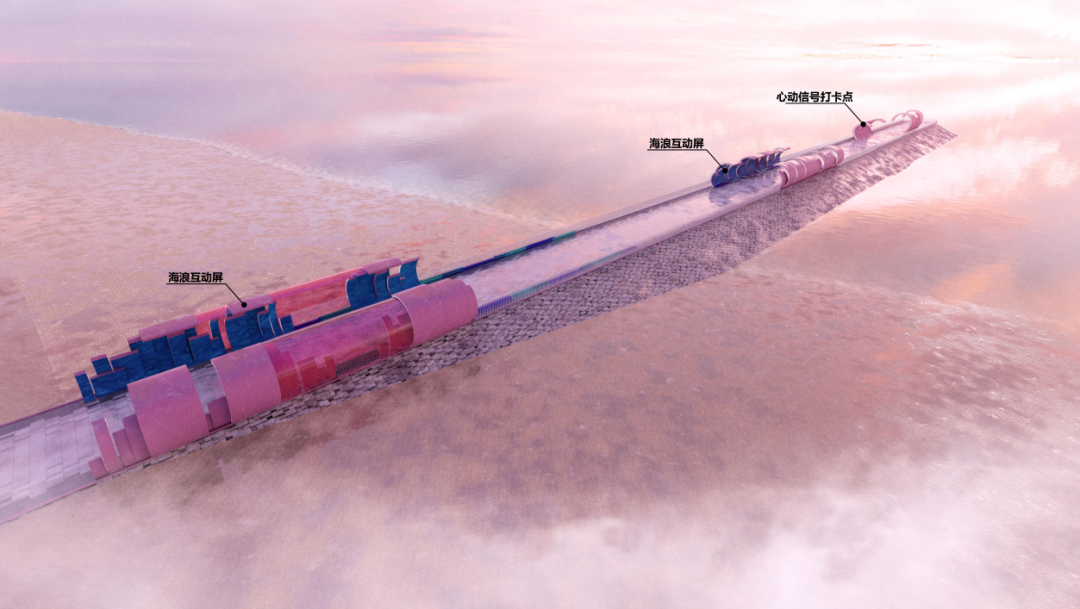 设置了海浪互动屏、心动打卡点、艺术地面和发光地面,构建成年轻化、高颜值的网红观海平台;