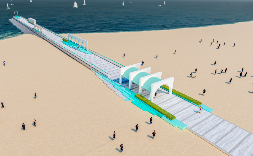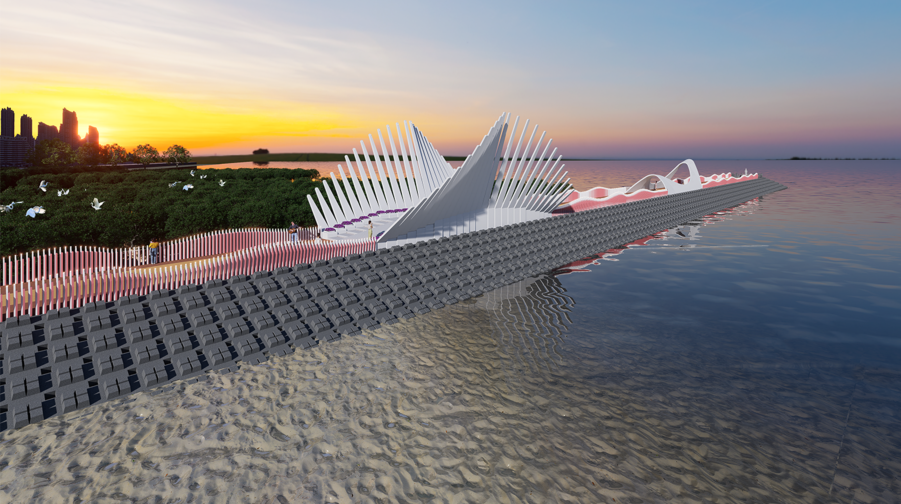 将丁坝比作鹭鸟的身体,通过阵列式羽状结构营造出展翅的姿态,打造出灵动优美的滨海标志性景观;