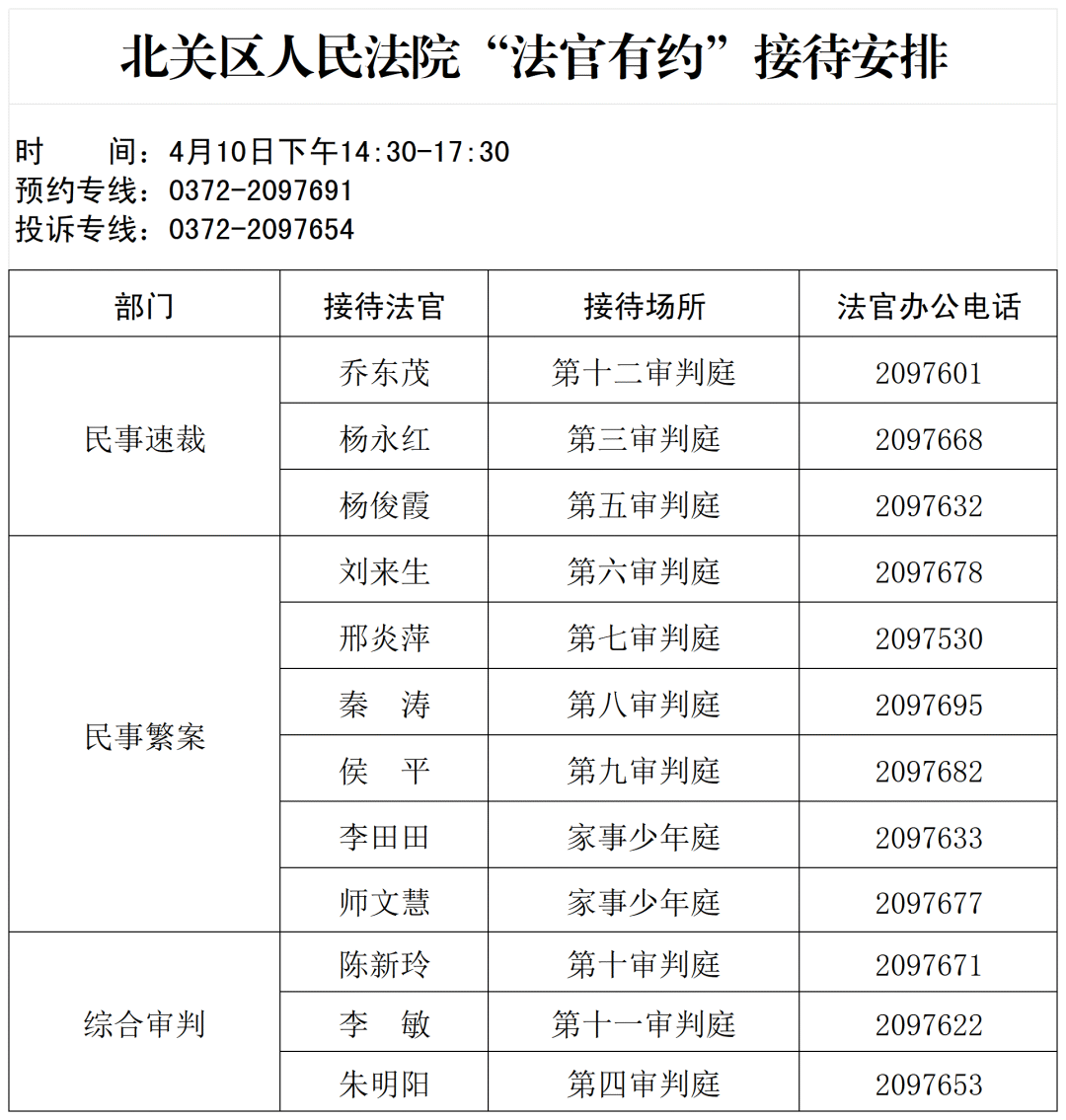 3. 请在固定接待日时间内来访,非接待日需提前拨打法官办公电话预约。