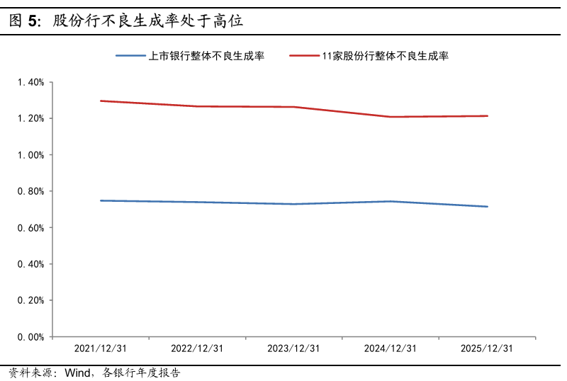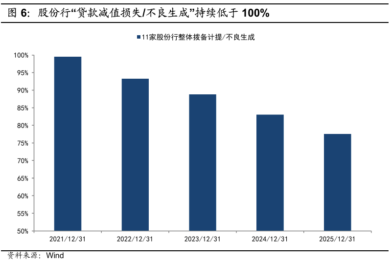 其三,不良生成率高企,拨备计提压力大。股份行不良生成率虽近年稳中有降,资产质量压力边际缓解,但仍显著高于行业水平——2025年整体不良生成率1.21%,远高于上市银行整体的0.72%。且“贷款减值损失/不良生成”指标持续低于100%,存在拨备缺口,利润平滑能力不足。