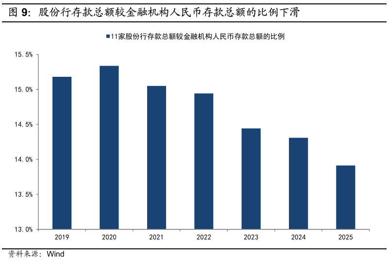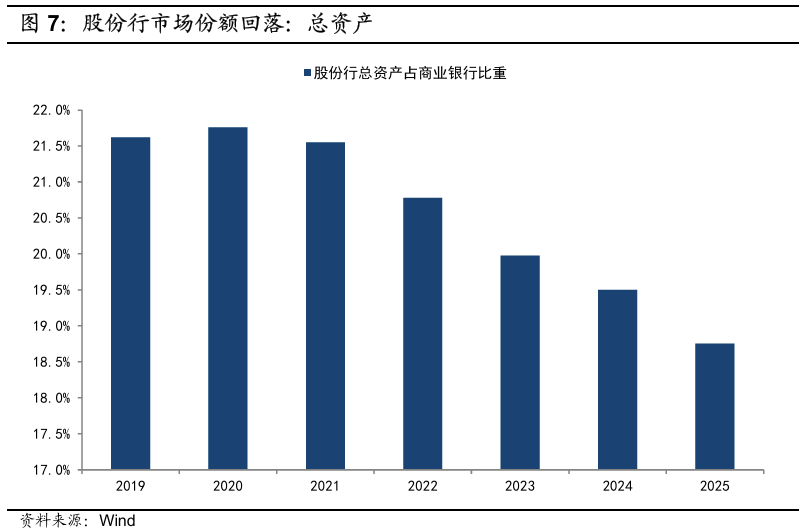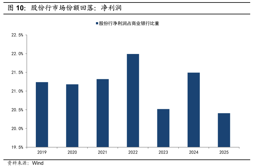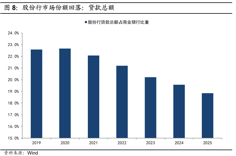 资产规模上,股份行总资产占商业银行比重2025年降至18.8%;贷款规模占比同步回落至18.8%;存款规模占金融机构人民币存款总额比例亦下滑;利润规模占商业银行比重2025年为20.4%,同样呈下降趋势。