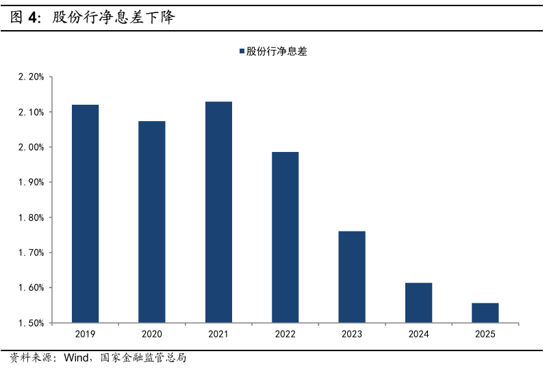 其二,净息差随行业趋势下行。国家金融监管总局数据显示,2025年股份行净息差1.56%,较2022年下降43个基点。