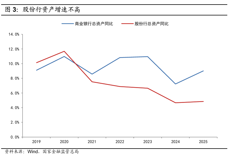自身层面:风险暴露后主动调整。房地产风险及零售领域(信用卡、消费贷、普惠贷)风险暴露,使股份行面临资产质量与拨备压力,因此主动放缓扩张,聚焦存量风险处置与资产负债结构优化,影响规模增长。