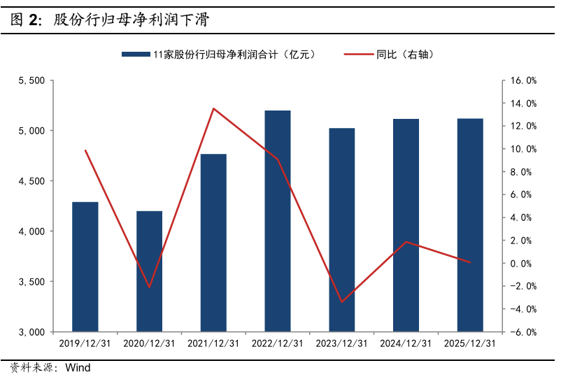 营收方面,2023-2025年11家股份行整体营业收入连续三年下滑,2025年合计营收1.54万亿元,仅为2022年的93.8%。利润端,11家股份行合计归母净利润在2022年达到5198亿元的历史峰值后回落,2025年仍未恢复至2022年水平。